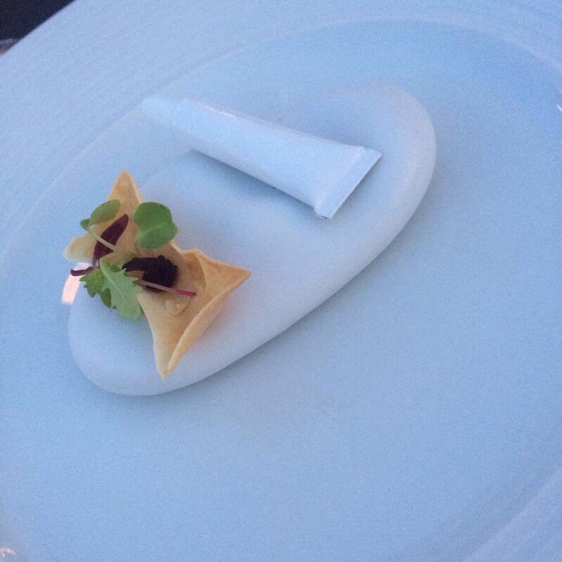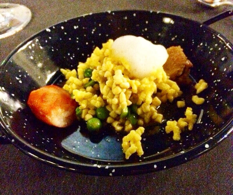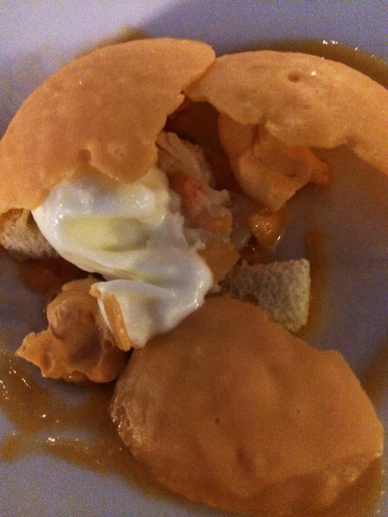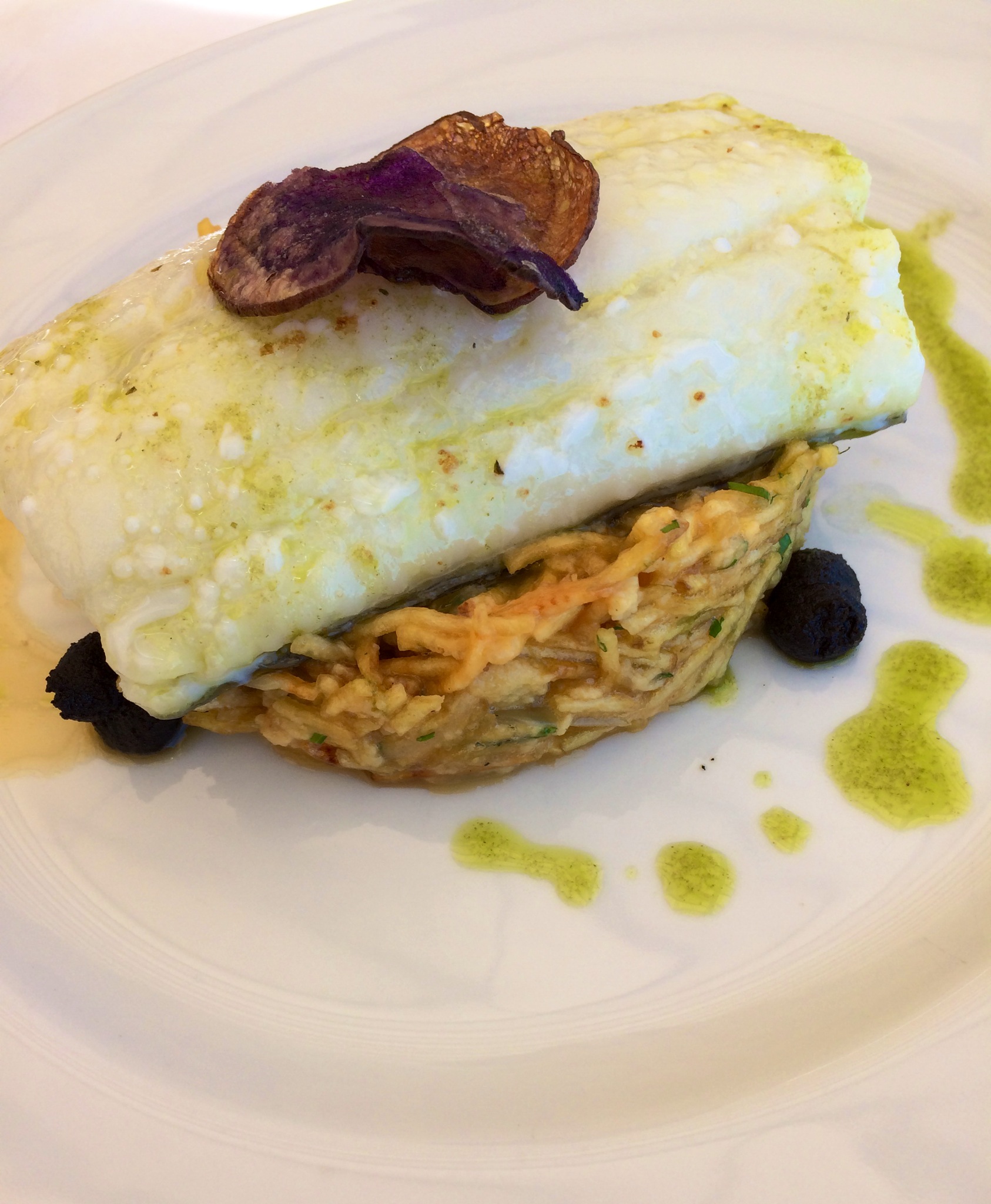 El bacalao escalfado en aceite virgen sobre bacalao a braz es otra inteligente reinterpretación de ese plato que en España conocemos como bacalao dorado y que no es otra cosa que huevos revueltos con bacalao, cebolla y patatas… paja. He ahí el secreto. El bacalao confitado aligera la receta llevándose con él todo lo que de graso y empalagoso puede tener el braz.
