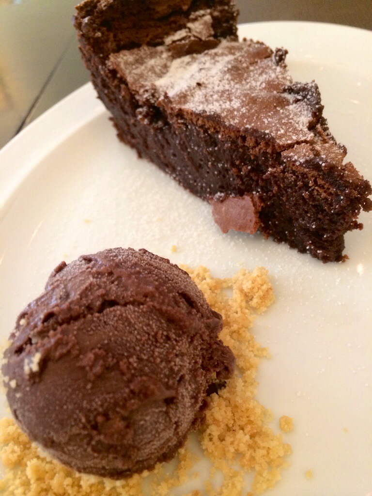 Para chocolateros como yo, la tarta de mousse de chocolate es buena elección porque no lleva harina ni otros añadidos. Sólo una excelente mousse, cubierta de láminas de chocolate negro crujiente y que recuerda la excelente de Pap’ Açorda, una espesa y fuerte crema que se sirve de un gigantesco balde con cucharón de madera, algo así como la marmita de Obelix pero post conquista de México.