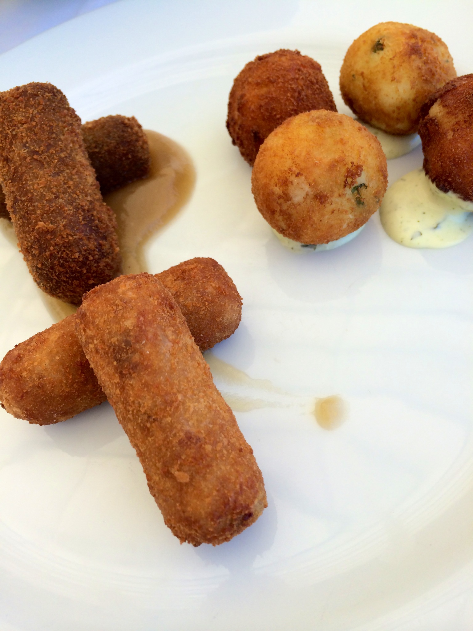 Las croquetas llegan tiernas y crujientes, en una variada mezcla: de alheira, el gran embutido portugués, quizá el mejor y más elegante del mundo, de camarones y algas, de bacalao y de ternera, estas dos últimas las madres de todas las croquetas portuguesas que, oh sorpresa, se preparan sin bechamel, por lo que resultan demasiado potentes.