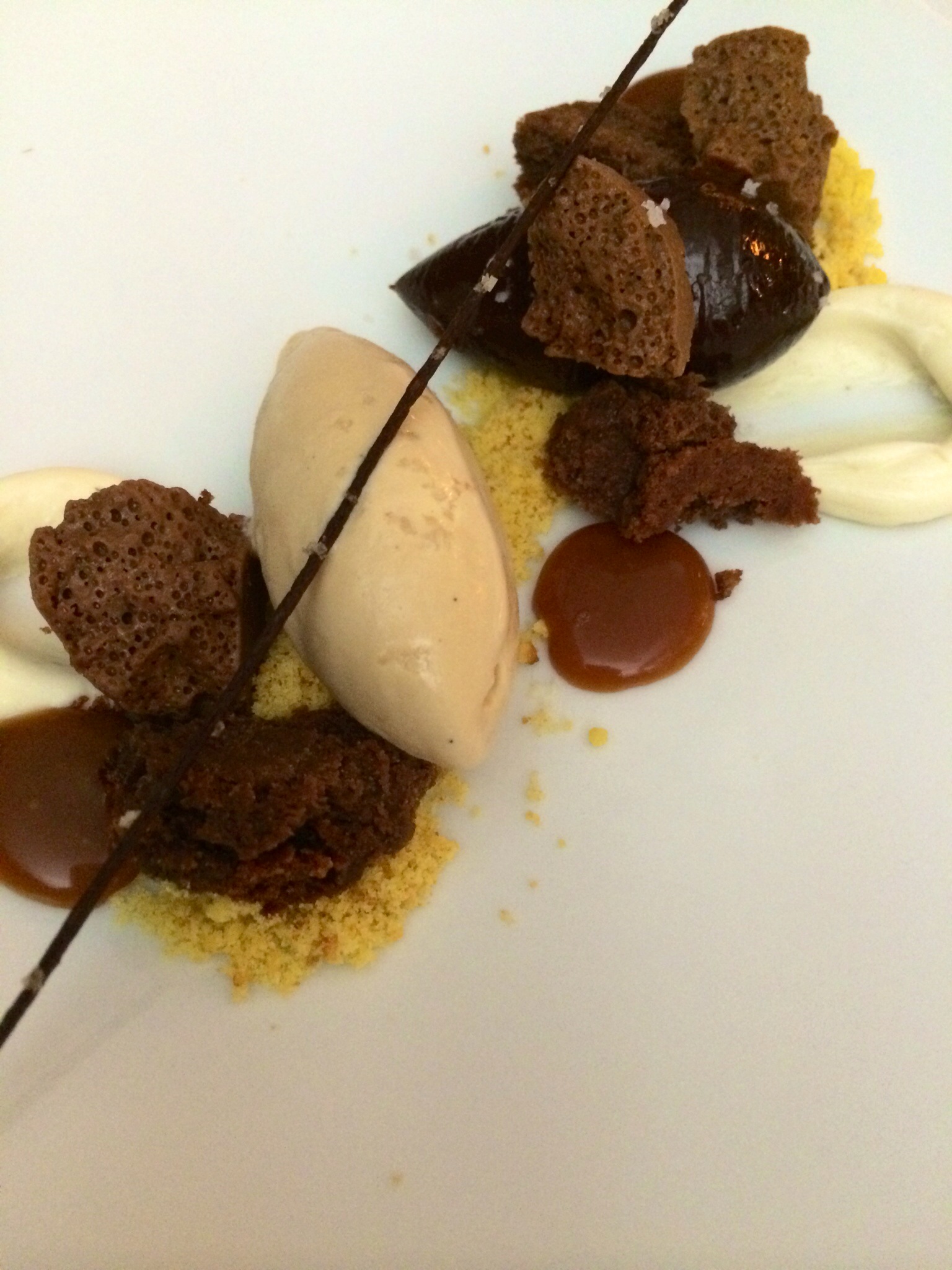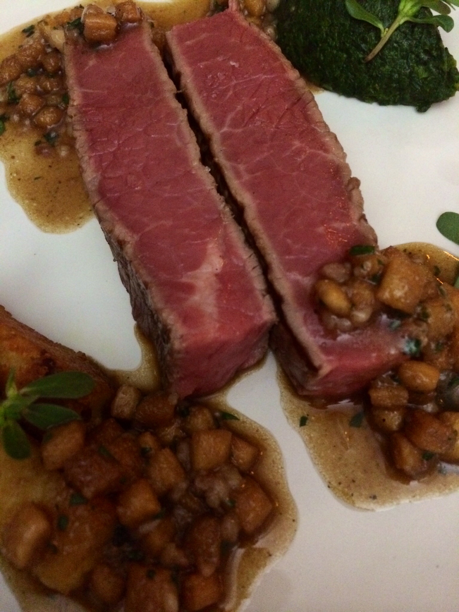El pato con puré de ciruelas secas, aceitunas y pera, participa del mismo espíritu que el resto del ágape, un protagonista de una calidad sobresaliente que no debe ser anulado o escondido por los accesorios, igualmente excelentes. Aquí la salsa es densa y deliciosa, perfecta para una carne fuerte y sabrosa, y el punto del asado, simplemente impecable. No hay más que ver la foto.