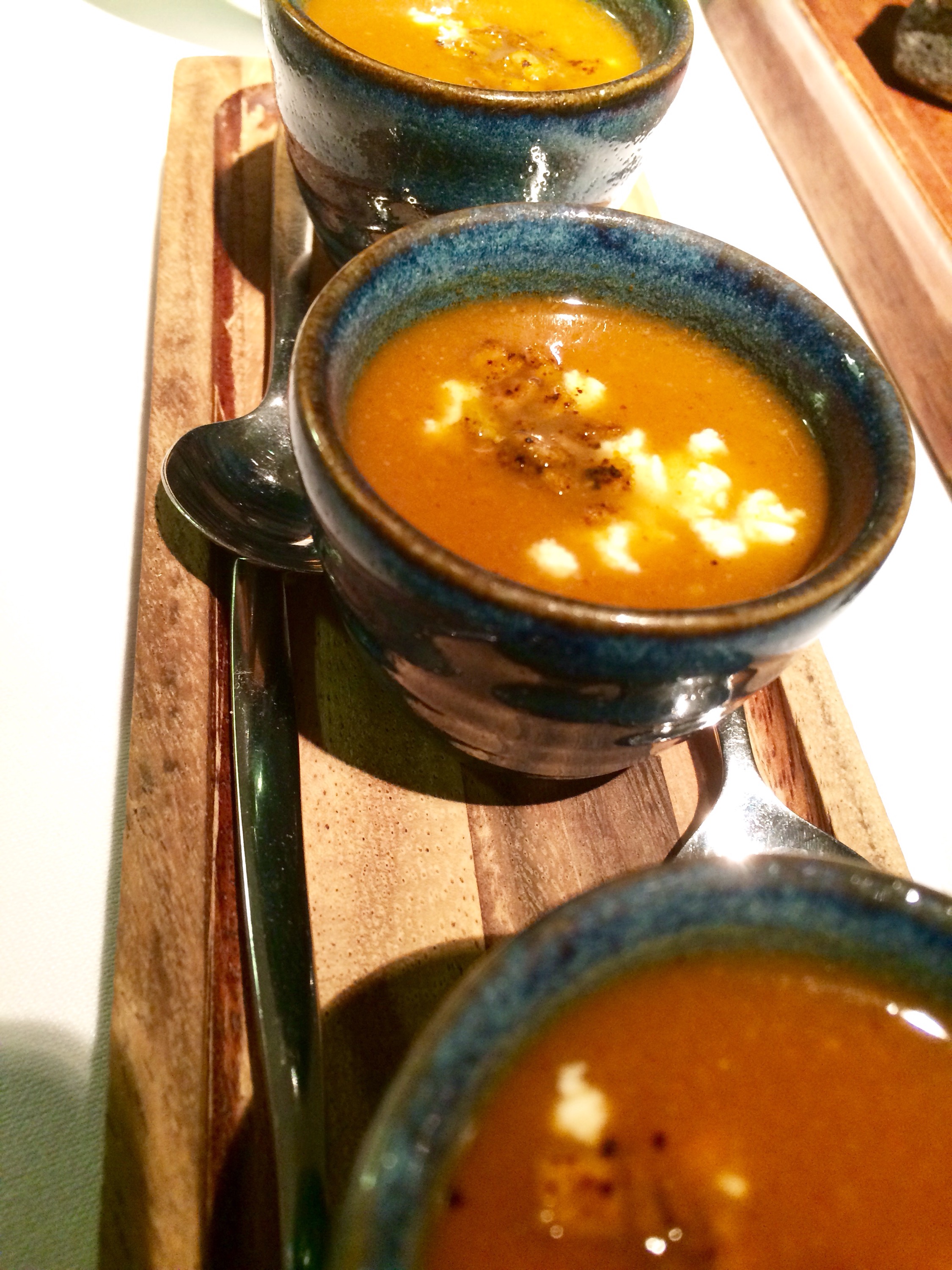 Llega la carne y es otro plato de belleza deslumbrante, el cubismo desordenado de cordero según lo llama, un tierno trozo de carne, acompañado de puré de calabaza, castañas y hasta una bolita de steak tartare, una auténtica belleza de circulitos de colores, deudora de Sonia Delaunay, pongamos por caso…