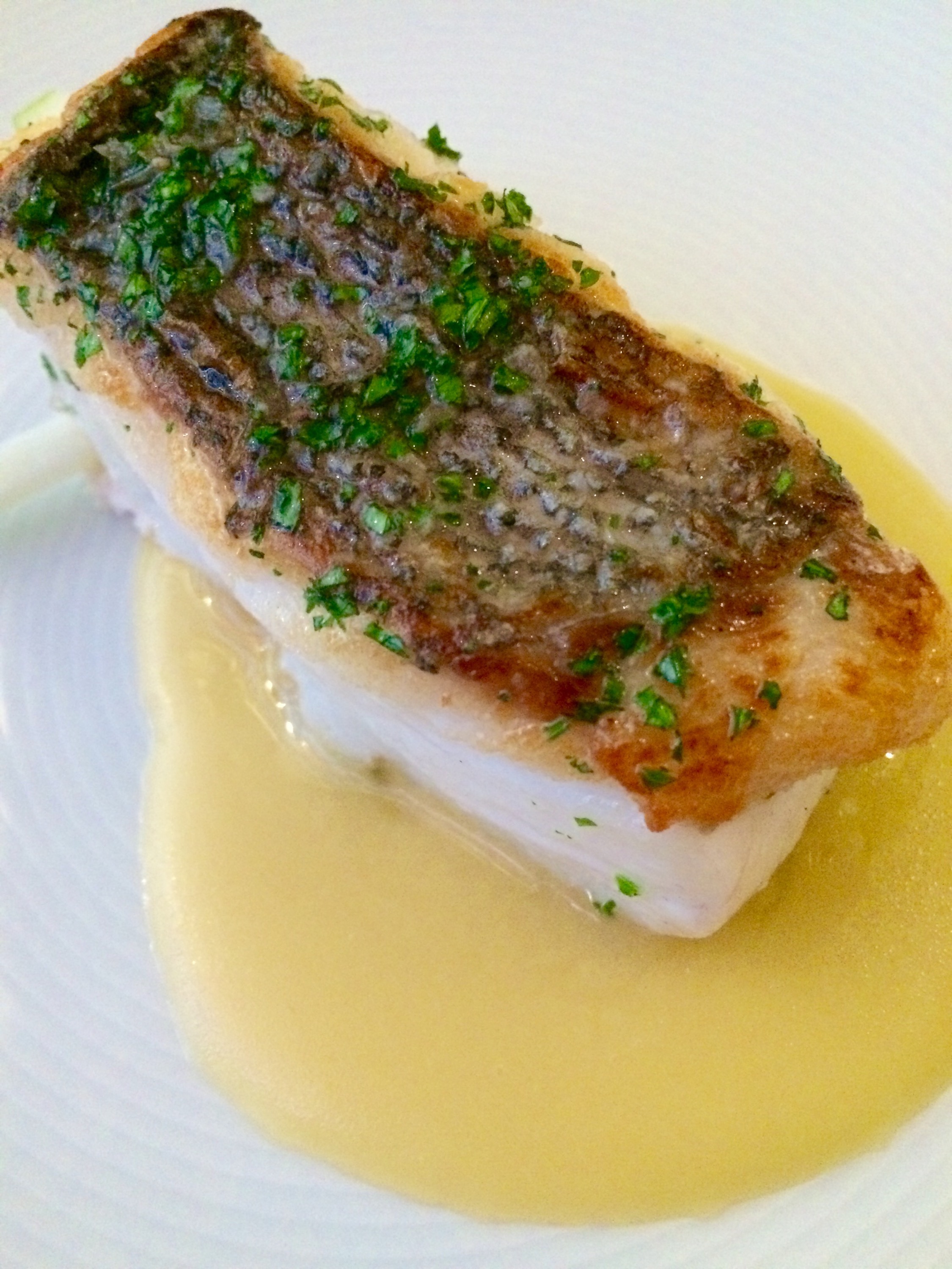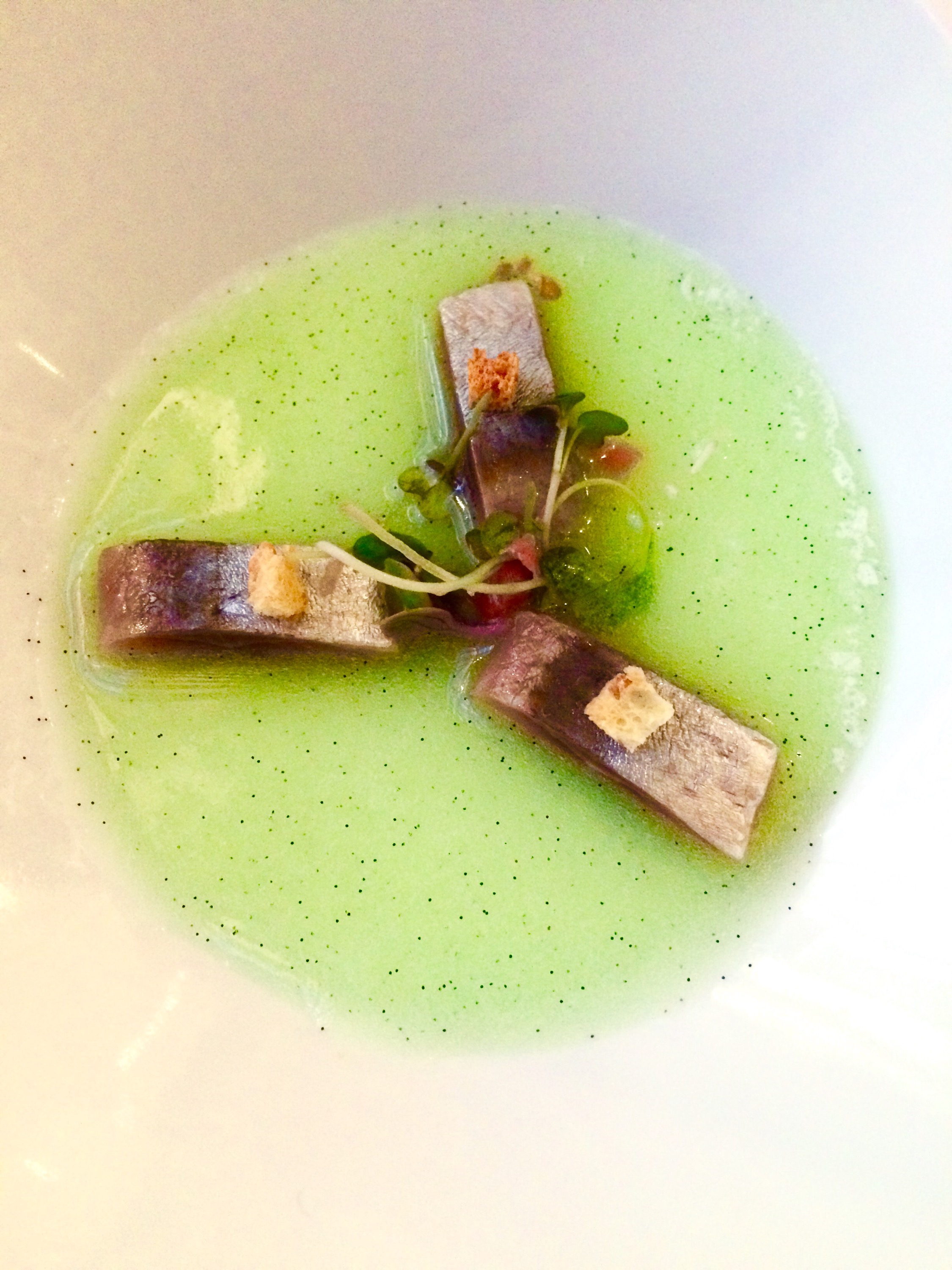El salmonete es también una pieza de gran calidad y sabor que se aliña con una salsa a base de su propio hígado (si lo llamamos foie parece menos bestia, ¿verdad?) y esferificaciones de una salsa verde de cilantro, pura esencia de almejas bulhao pato, las excelentes almejas portuguesas en salsa de ajos y cilantro. No hará falta decir que el sabor es fuerte y atrevido y que quizá no es este lugar para amantes de sutilezas.