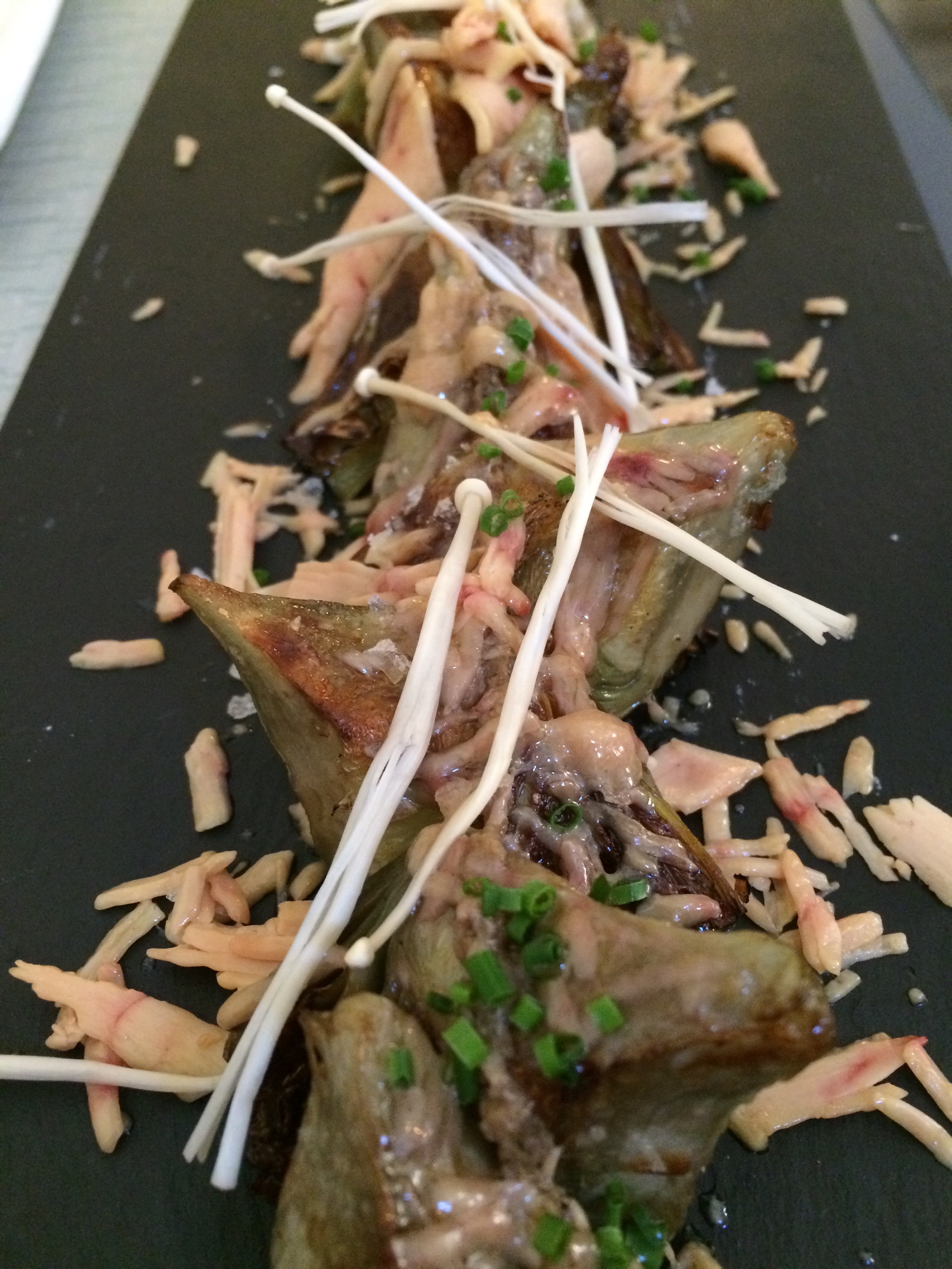 Si cada paso de este menú está concebido como una obra musical, la llegada de la carne supone un claro crescendo. El punto del pato, una excelente, jugosa y tierna ave, es perfecto y el jugo que la enriquece desborda aromas a campo y a caza, sin gota de grasa y con una trabazón impecable. Lo endulza una oblea de pera y col con toques de salvia frita que se eleva sobre la banalidad de los frutos rojos, sempiterna guarnición de patos y caza. Al lado, se coloca un pequeño pote con un hojaldrito del hígado y un pedacito de pierna, que nada añaden.