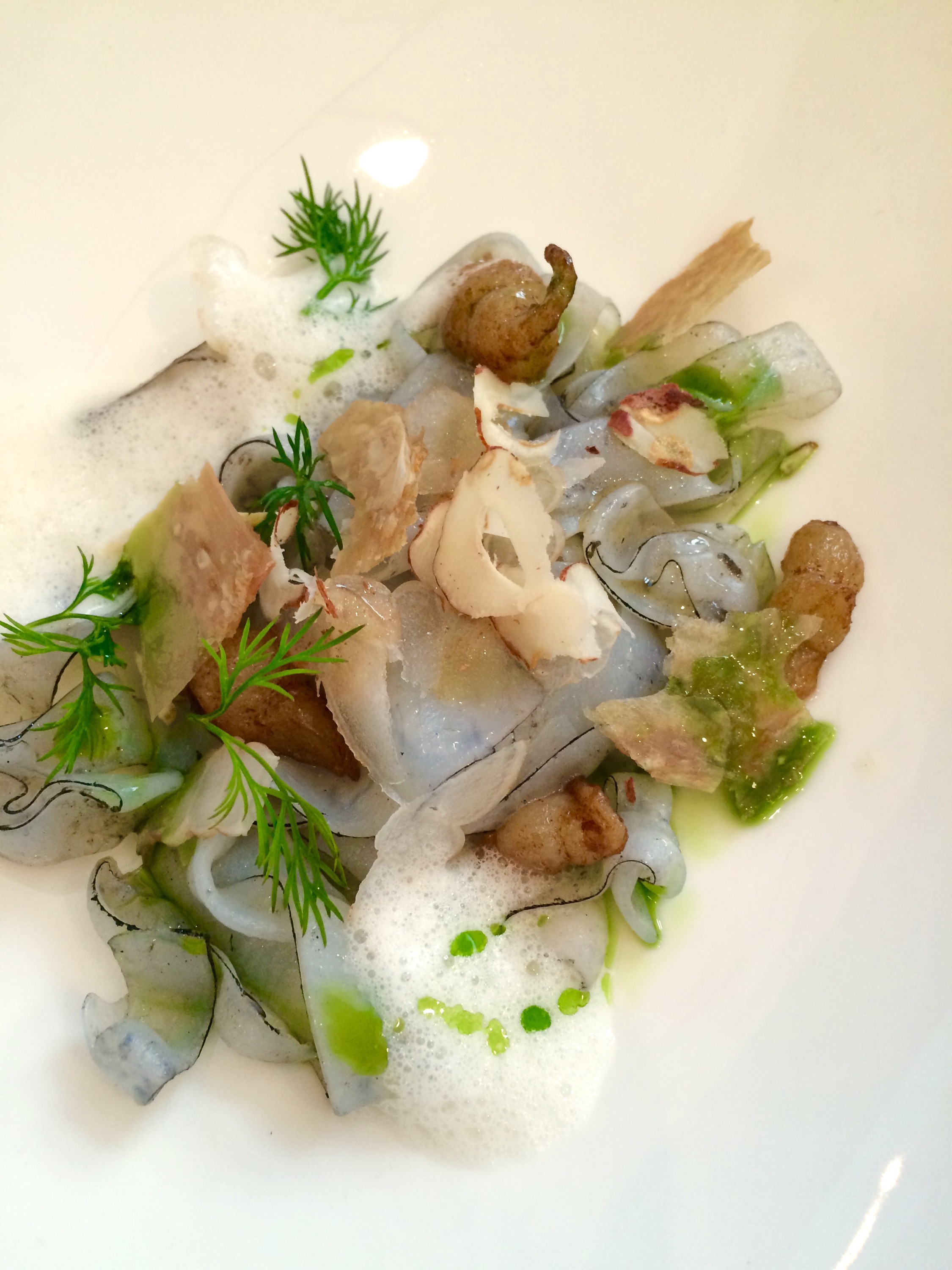 Las vieiras con ostra, médula de buey y kombu -en gelatina y crema con manteca- es una manera diferente, aunque no original, de cocinar los pescados. Todos los sabores se preservan y el buey le da un toque cárnico que hasta hace no tantos años se pensaba inadecuado para el pescado. El rollito de cilantro y hierbas que lo acompaña refresca el final y está sabiamente ejecutado. Es un acierto porque el epílogo del plato deja demasiadas sensaciones grasas.