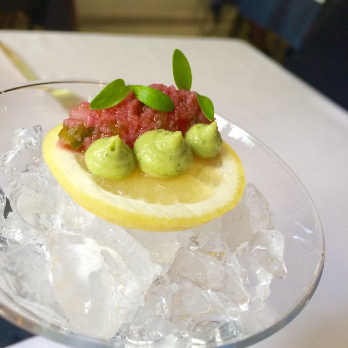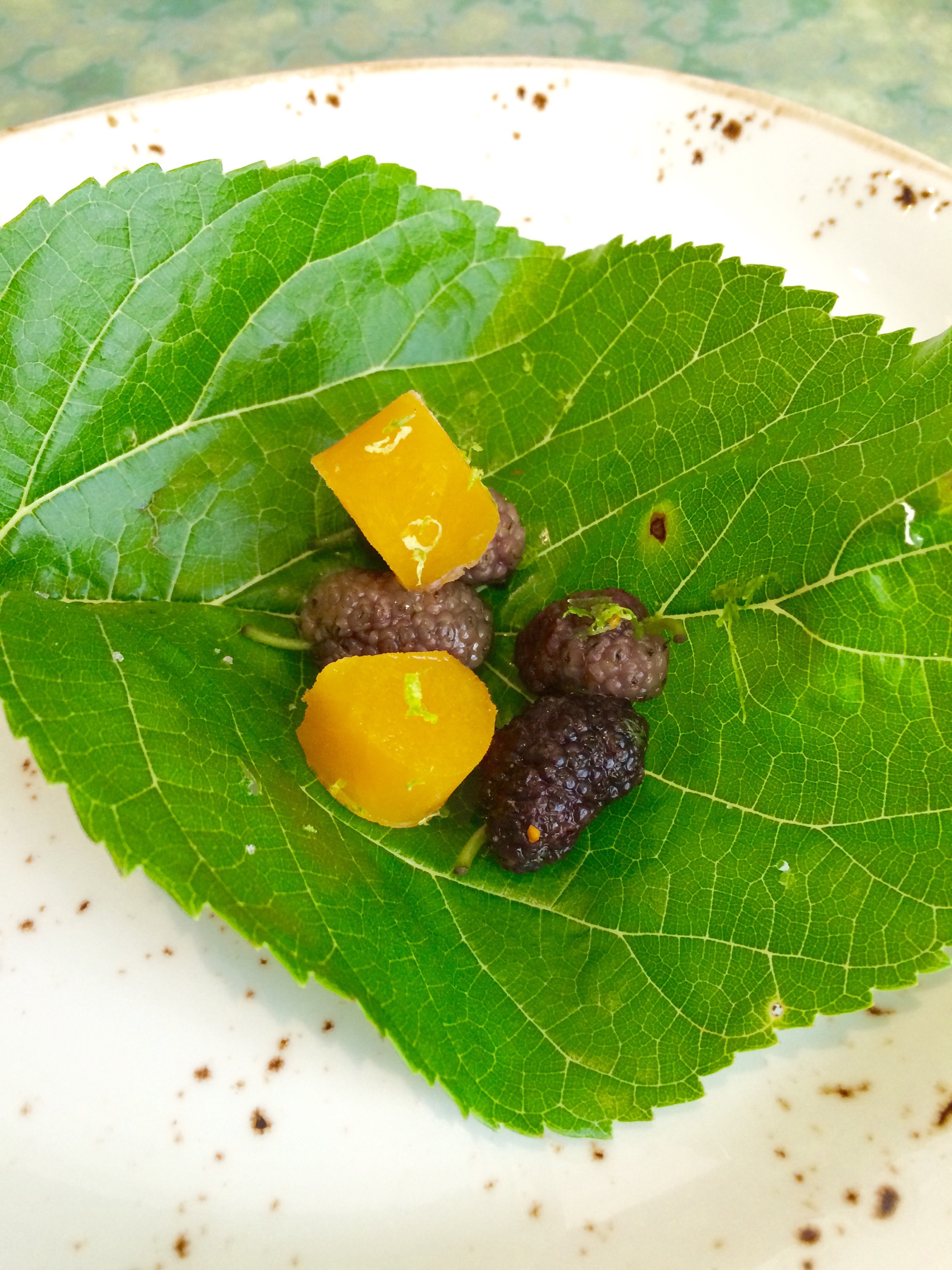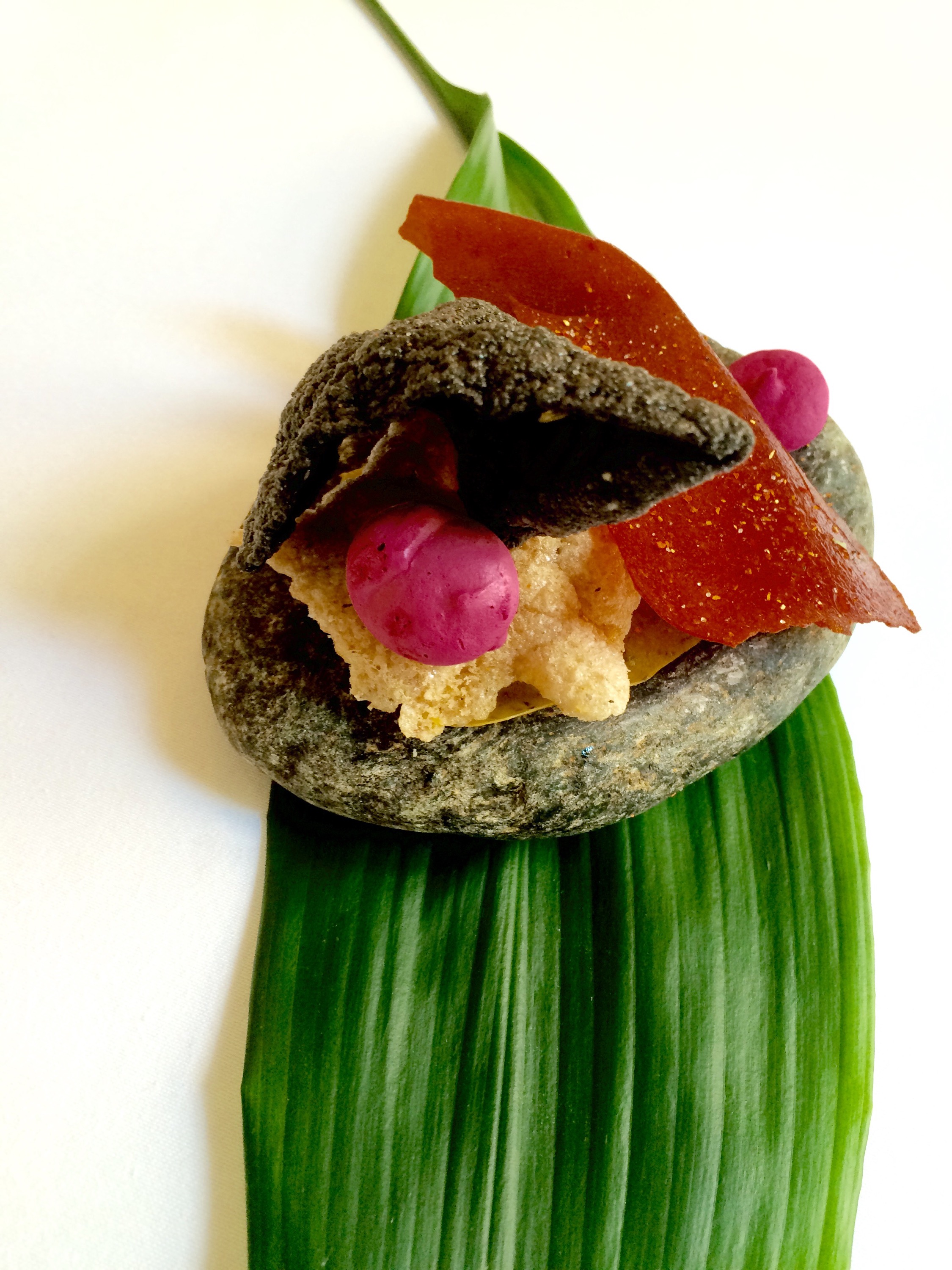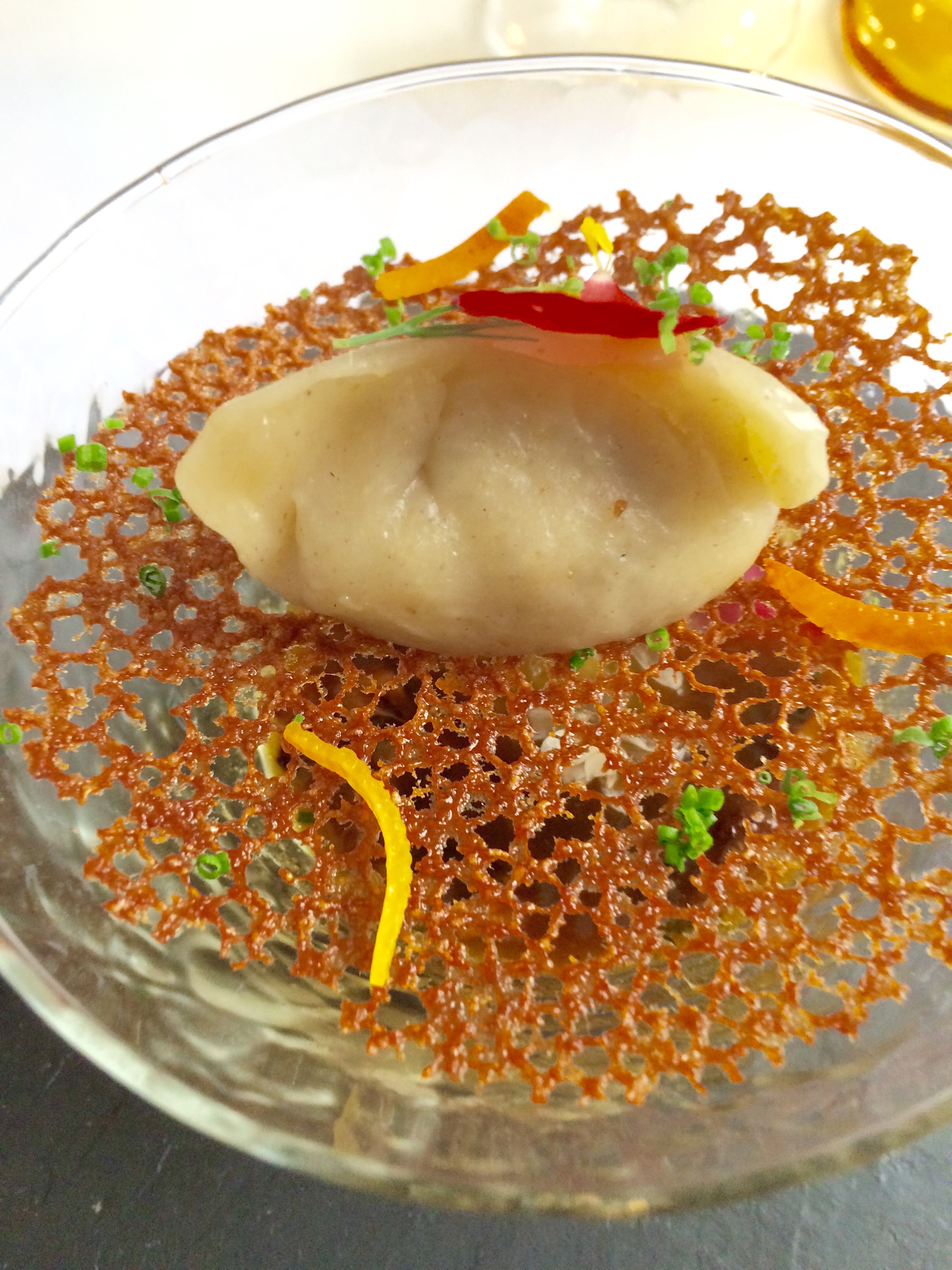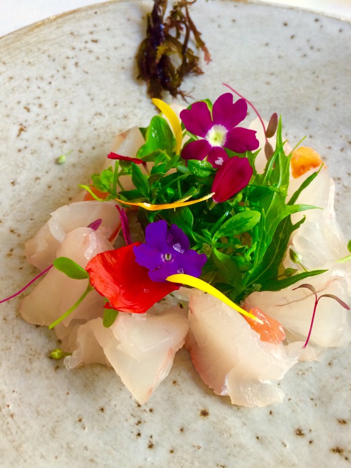 El tiradito de melocotón con su hueso comestible le da un punto dulce y refrescante al pescado y el hueso es otro delicado trampantojo que, en esa audaz ruptura de las normas tan de la cocina actual, bien valdría como postre.