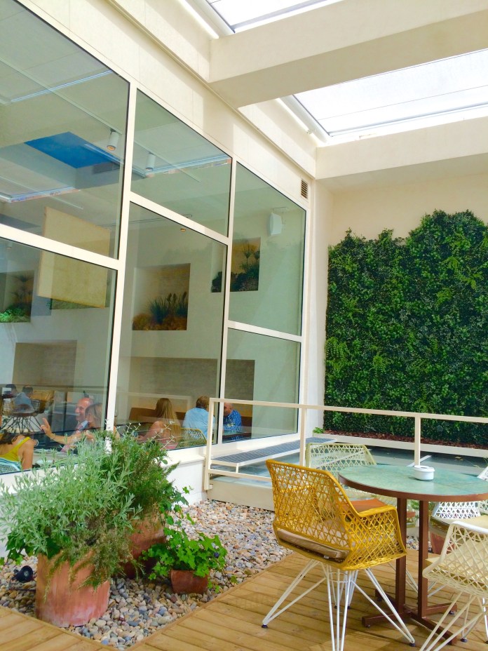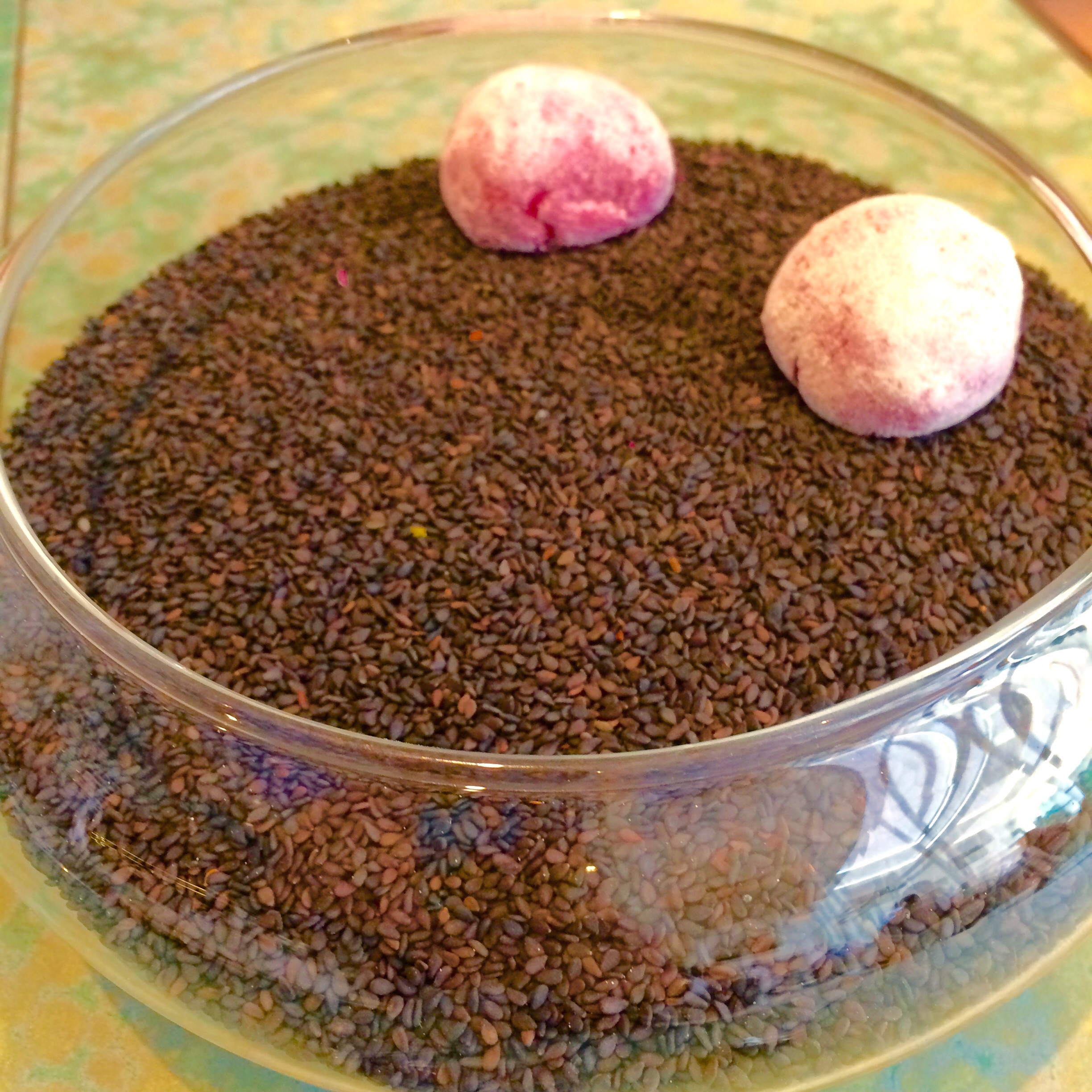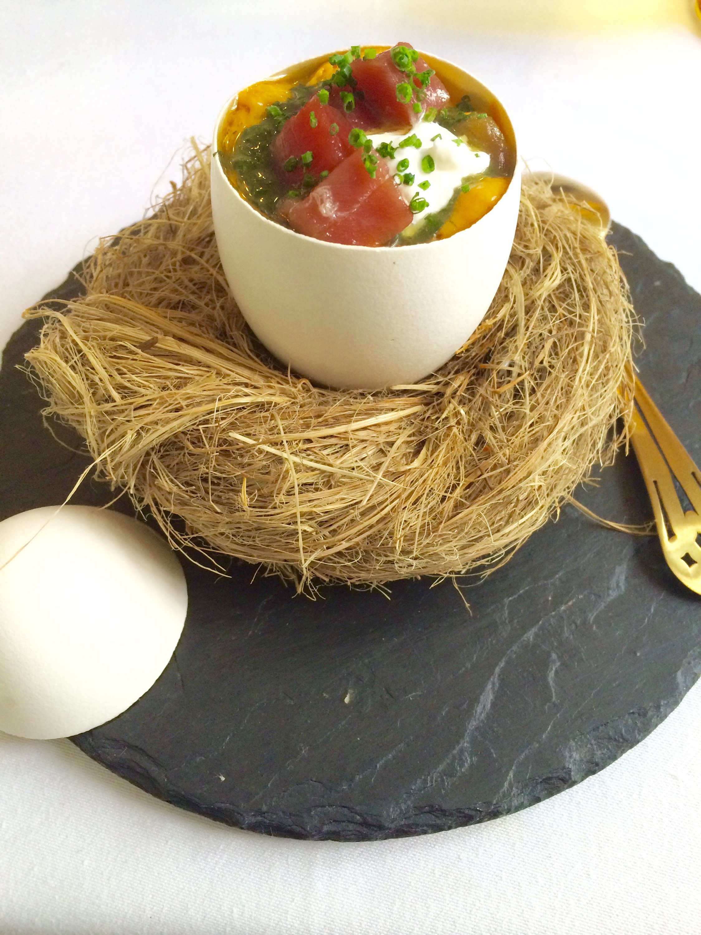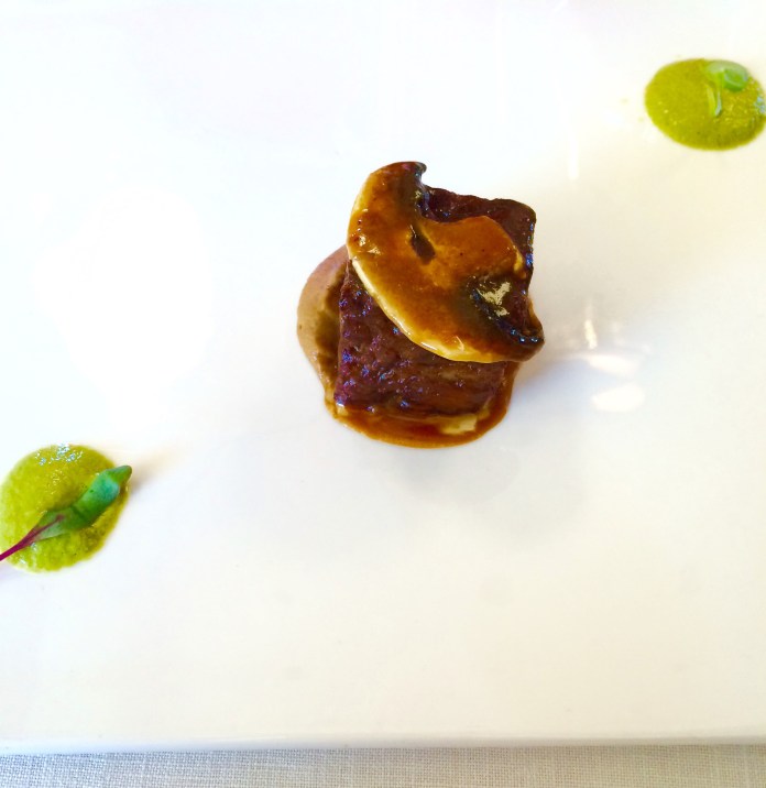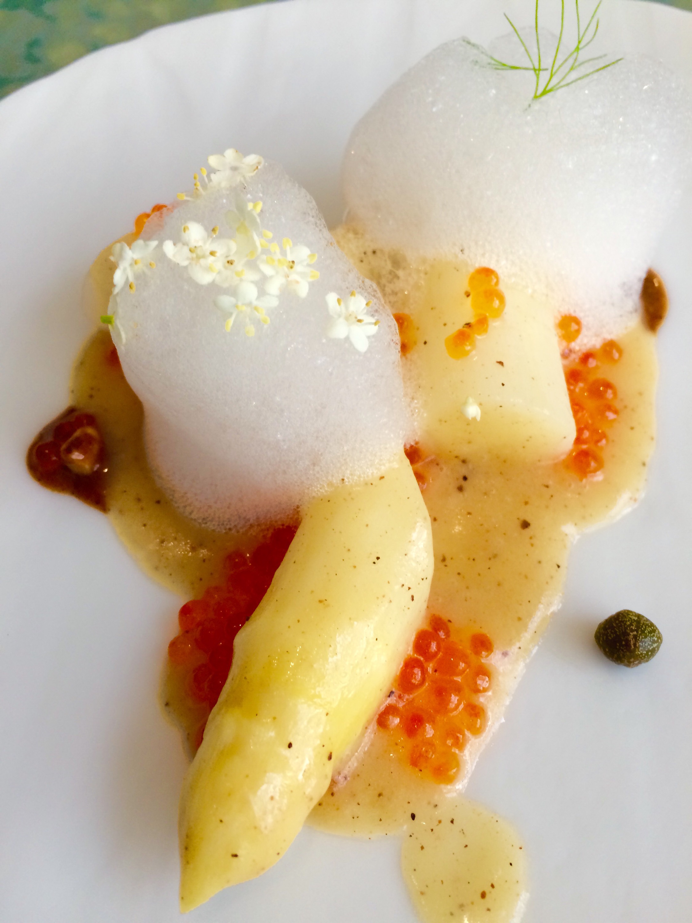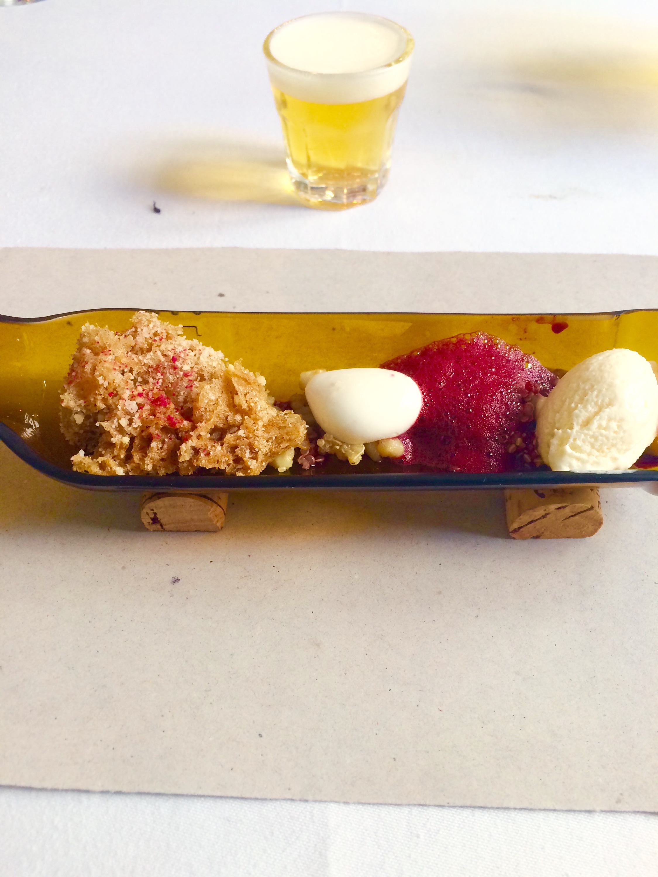 Si los tomates, aunque americanos, son base de la dieta mediterránea, los salmonetes son uno de sus pescados fetiche. Más bellos que las sirenas en su cola de plata y corales escarlata, son la aristocracia de nuestros peces. Los de Freixa, grandes y suculentos, reposan sobre una espectacular crema de algas, la primera que me gusta verdaderamente, ya que la tendencia es poner algas crudas en la boca por lo que su sabor es fuerte y en general, demasiado tosco. Estas se enriquecen y suavizan con otros ingredientes, como judías y almendras tiernas, que las domestican y refinan notablemente.
