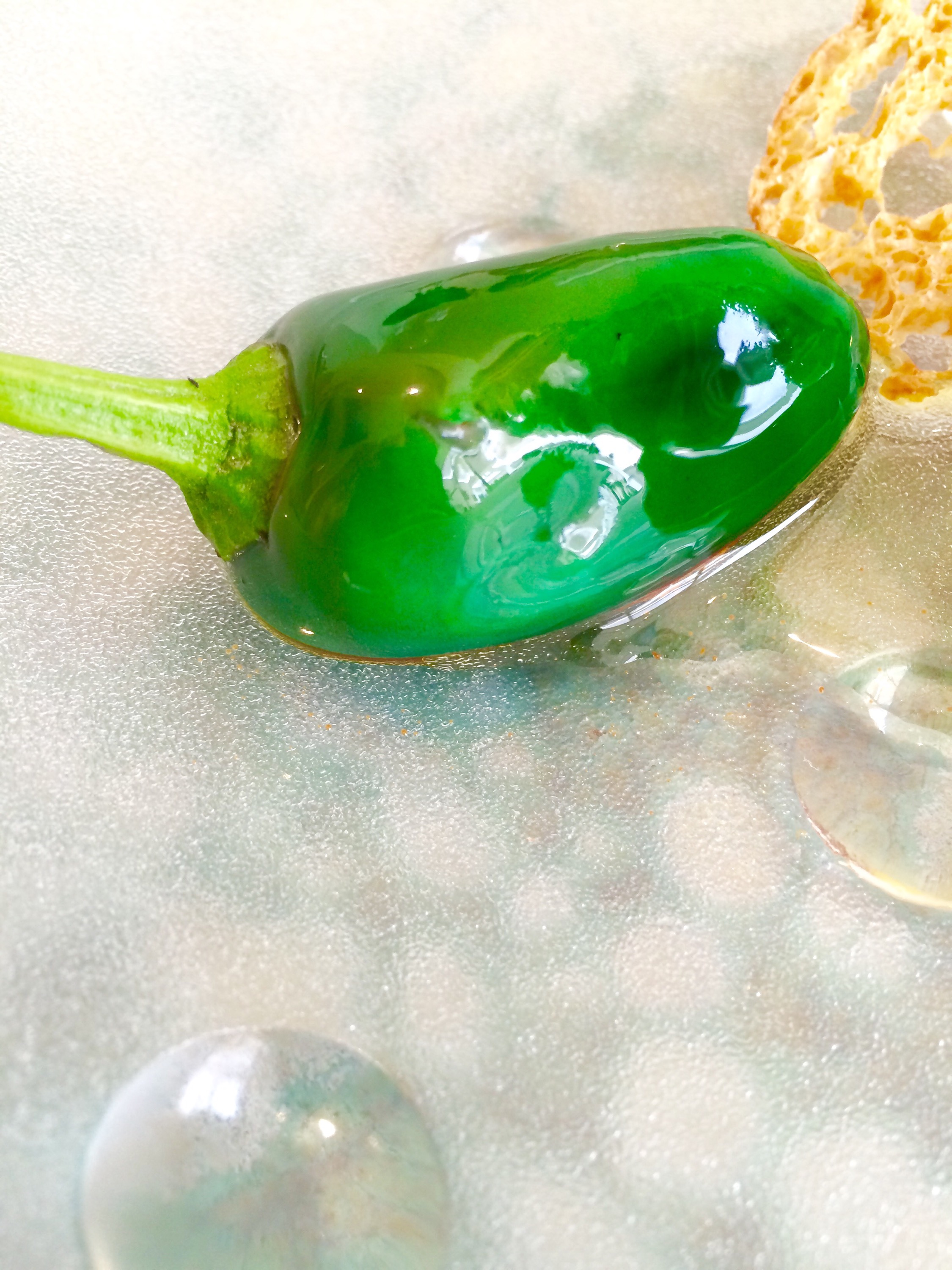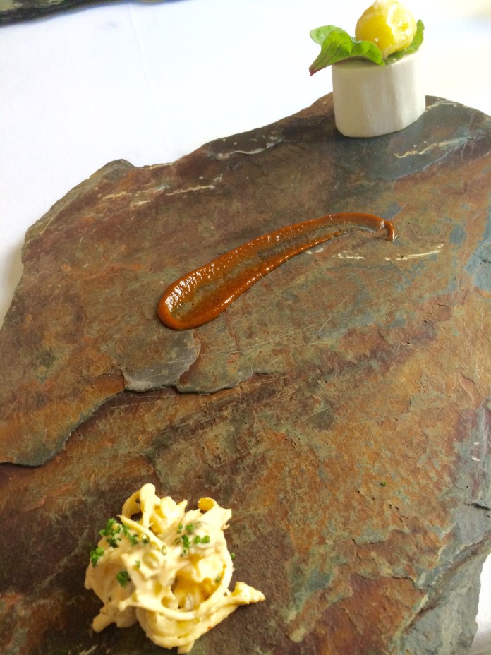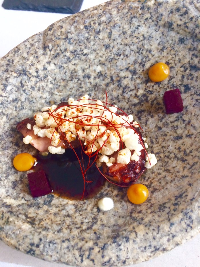 Nadie podrá decir que no es una composición hermosa pero no es más que preparación mental para una auténtica belleza, la del pescado azul escabechado en directo con su raspa, que combina una excelente caballa marinada con un crujiente y un tomate perfecto que es un gran engaño, porque es una esferificacion que, al estallar en la boca, la llena con todos los jugos del producto.