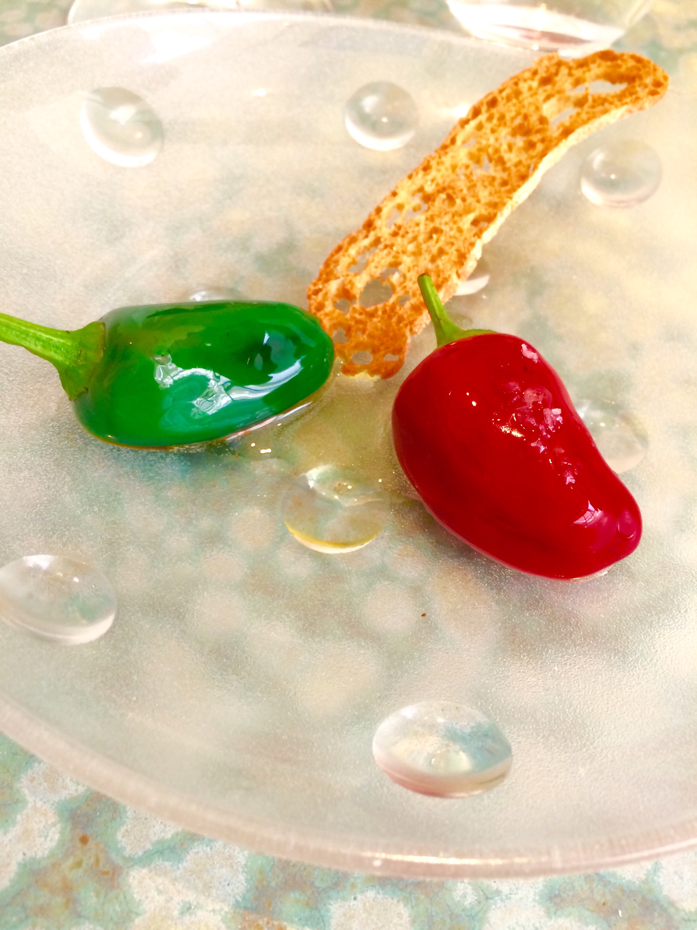 Hay más cosas –pan tumaca con salchichón, piedras de queso manchego, esturión con huevas vegetales, etc- y todas deliciosas, pero nada como esos tomates que son el leit motiv de este post y que llegan en cuatro pasos: una ensalada que combina diferentes tipos y variadas texturas y además las mezcla con algo de melón, chips de jamón y unos excelentes tallarines de lo mismo construidos con gelatina, una mezcla que pone todo el verano en un plato!