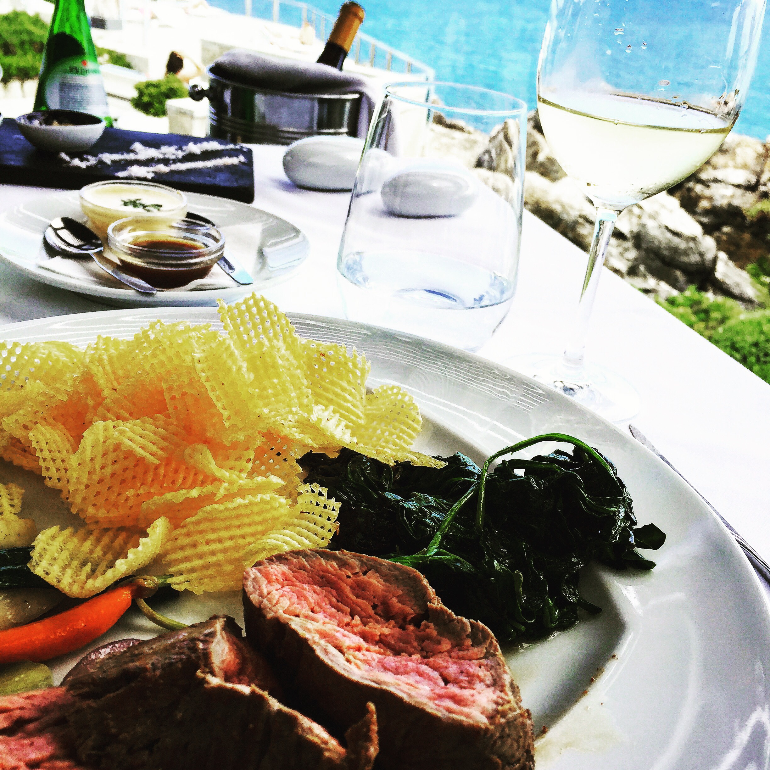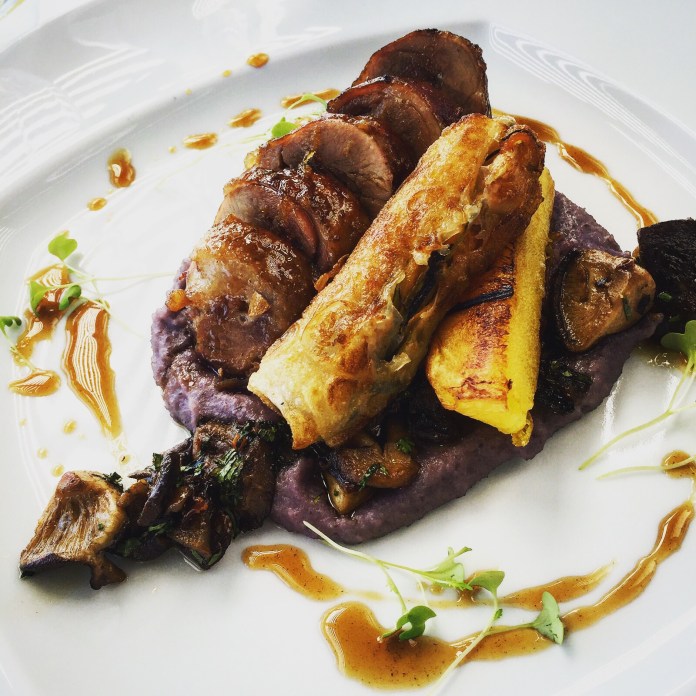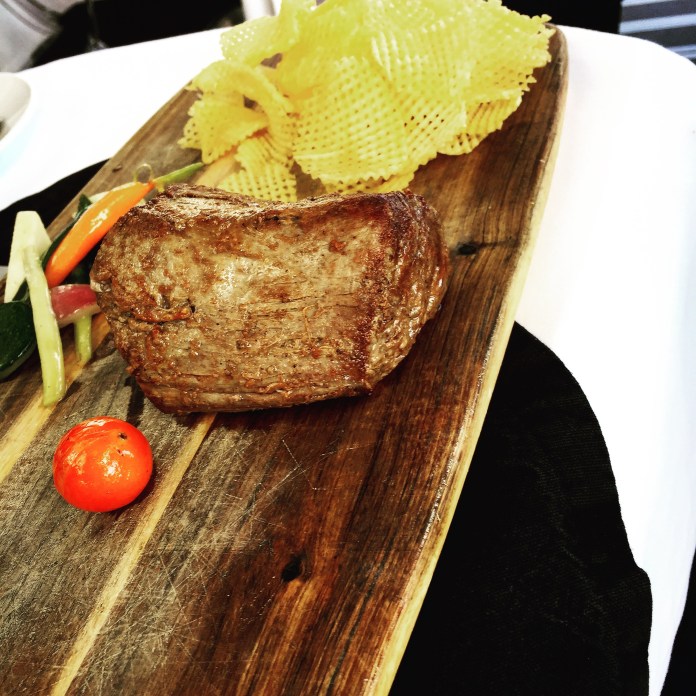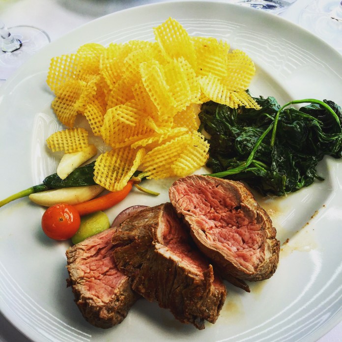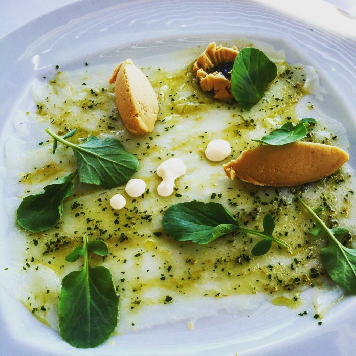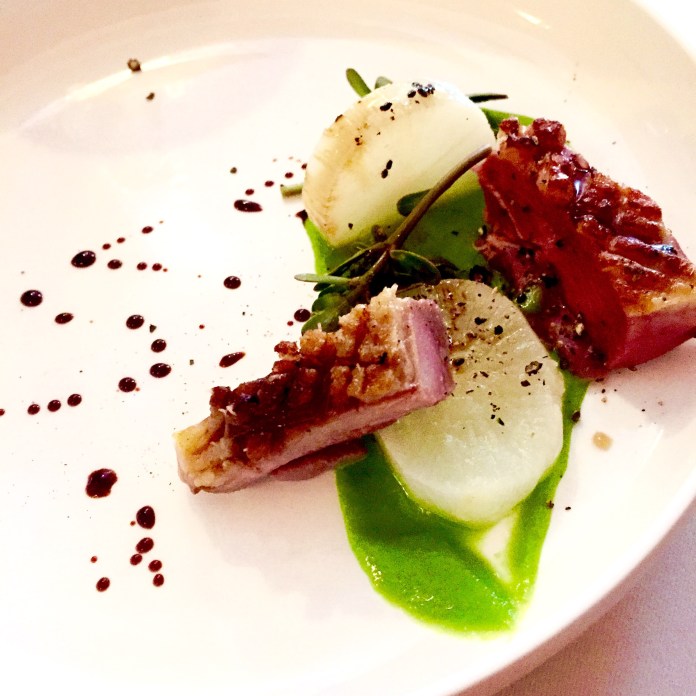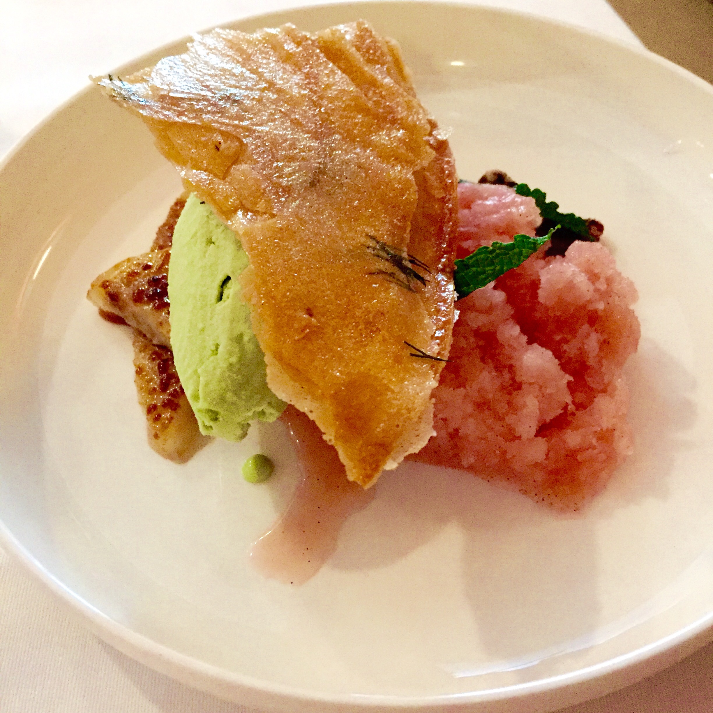 Los dos menús de degustación anteriores han sido sustituidos por uno que llaman Set menú de ocho pasos y que empieza, a modo de aperitivo, con una sopa fría de pepino realmente deliciosa y ya tradicional en esta casa. El verdadero ágape comienza con un delicioso y muy bonito pato con nabo, puré de guisantes y vinagreta de apio. Es un buen plato, aunque el nabo le aporta poca cosa más que su deliciosa textura y un elegante contraste de color, pero es que es tan triste un nabo que la sabiduría popular no se equivoca esta vez: cara de nabo, es un nabo, parece un nabo…