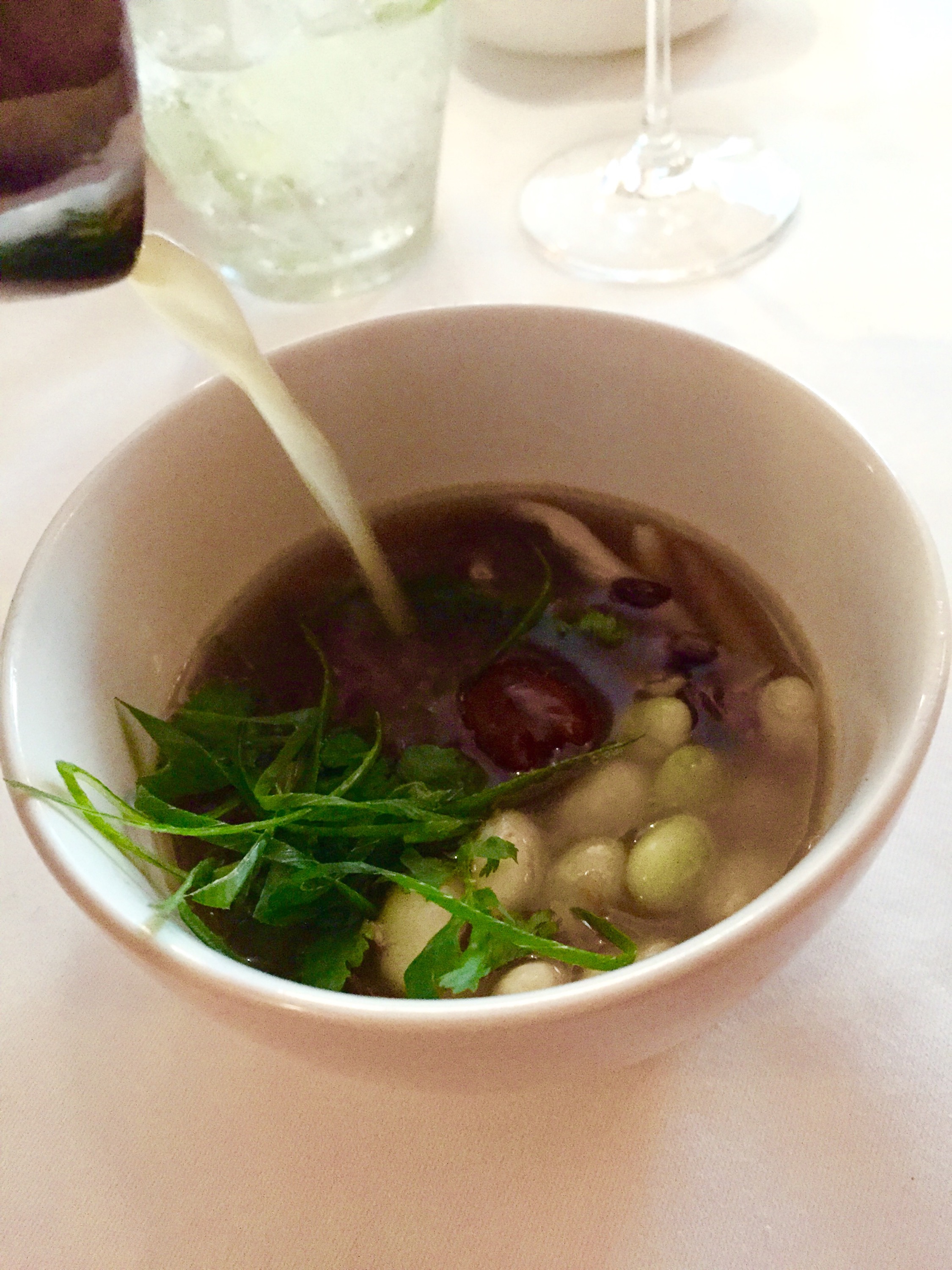 La sopa ácida de cangrejos con almejas, pochas y setas de temporada tiene un fuerte y delicioso sabor al crustáceo y contiene numerosas hierbas y hojas porque, ya se ha visto, Estanis no es el argentino del tópico y es un maestro en en mundo verde.