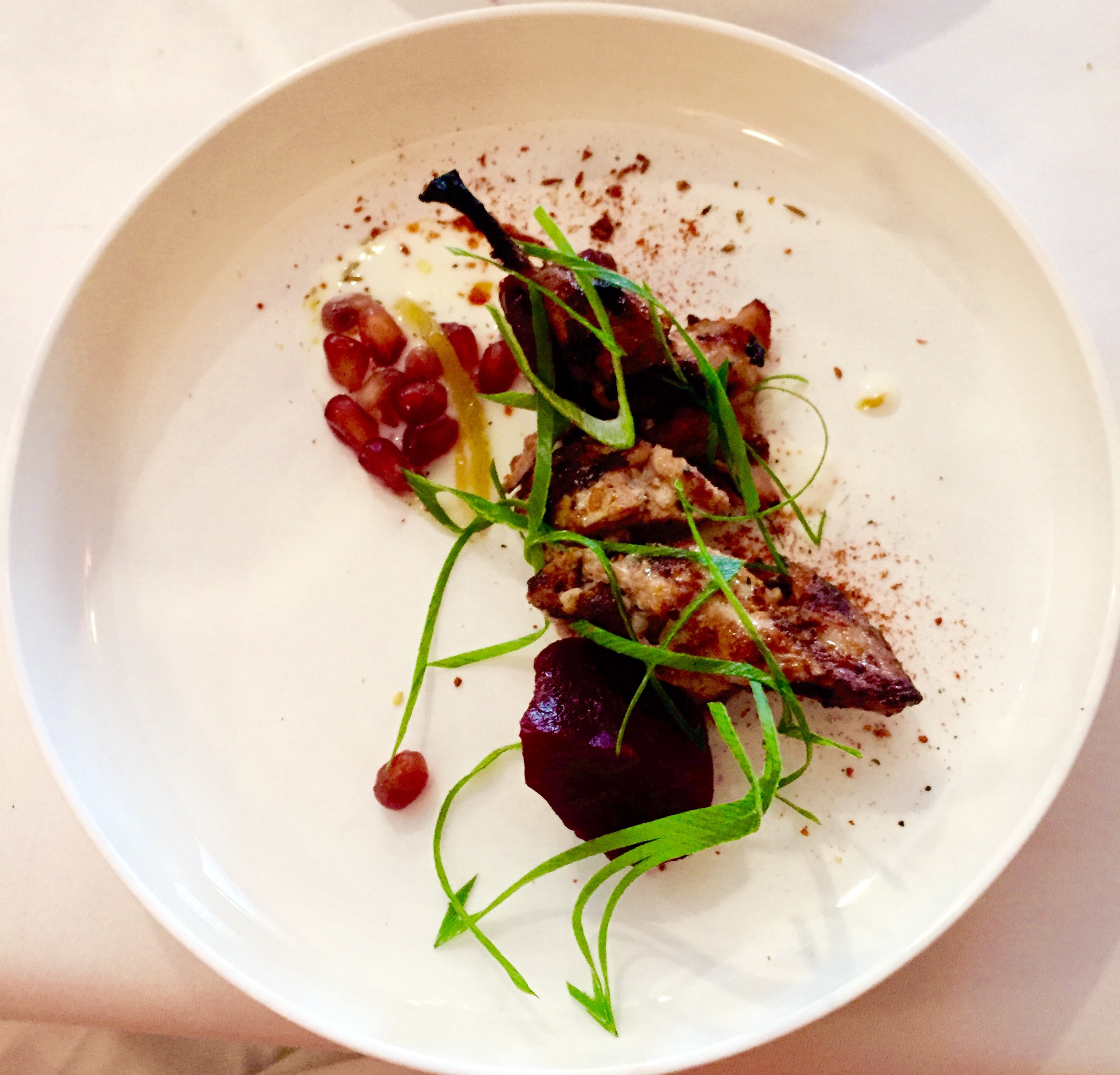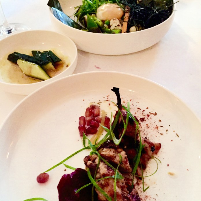 La codorniz tandoori con arroz japonés se engalana con blanco de yogur y escarlata de granada y se acompaña de pepinos encurtidos y un arroz de chicharro ahumado tremendamente meloso gracias a un huevo cocido a baja temperatura que se mezcla en el momento.