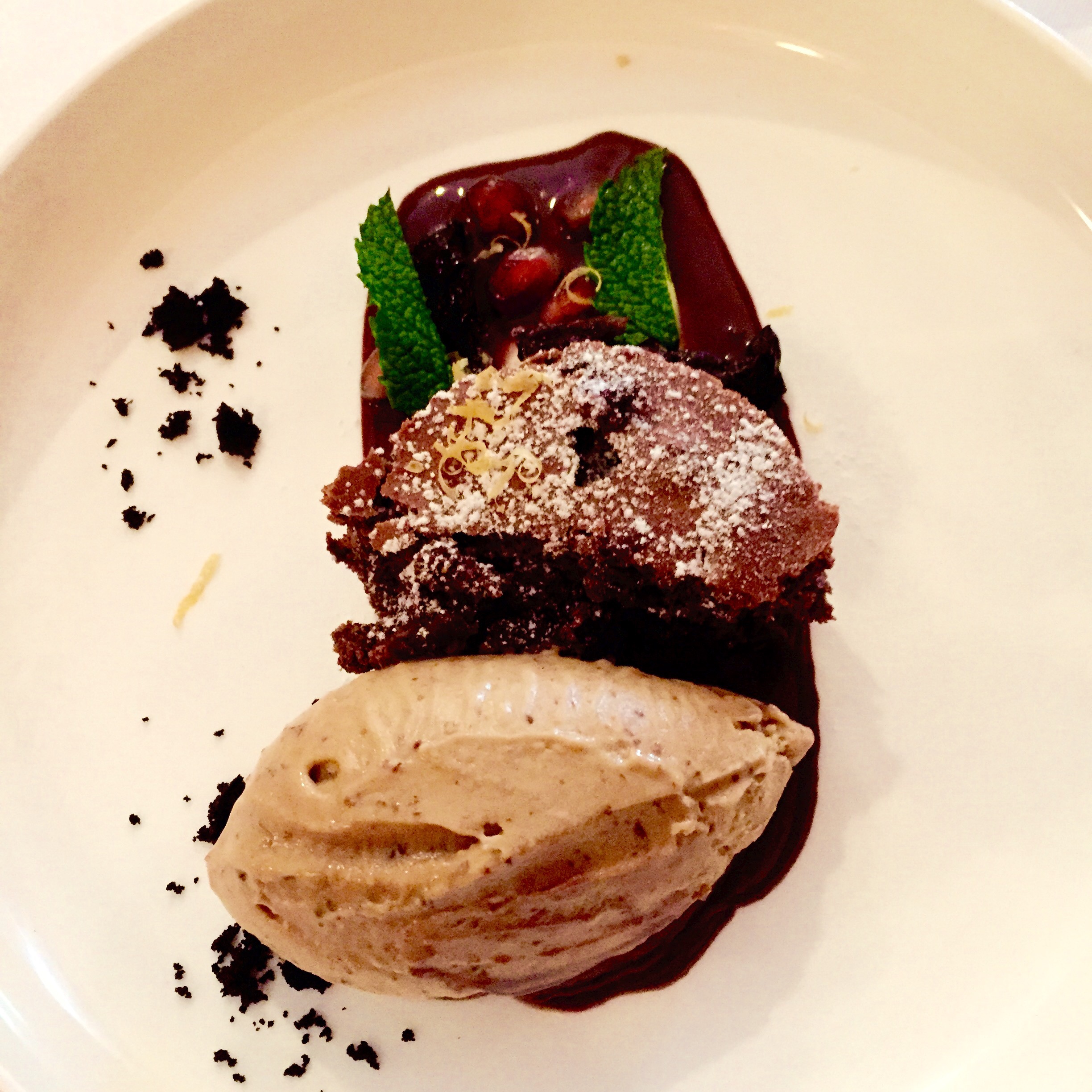 Los postres son a elección del comensal entre los tres que ahora mismo figuran en la carta. Como soy muy chocolatero no pude resistir al excelente pastel de chocolate sin harina con ganache de chocolate y helado de ciruelas, tan equilibrado en dulces y amargos que contenta a los muy dulceros y a los no tanto.