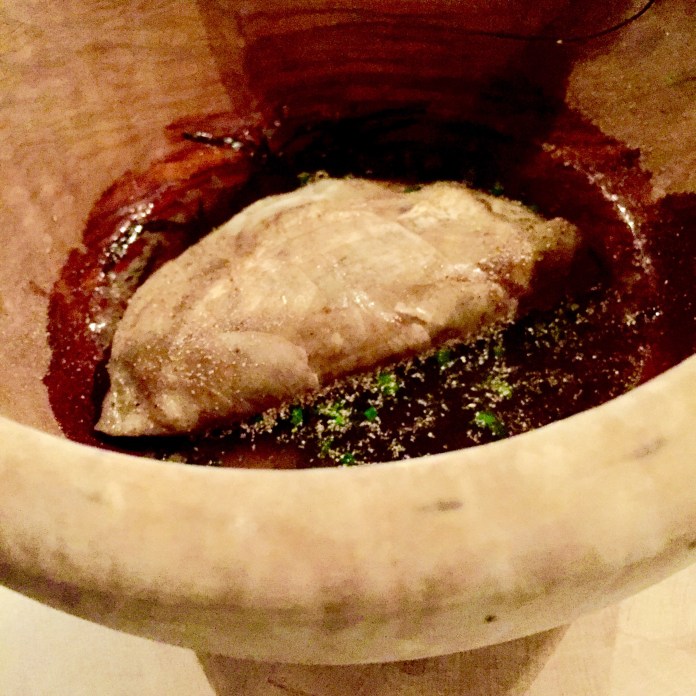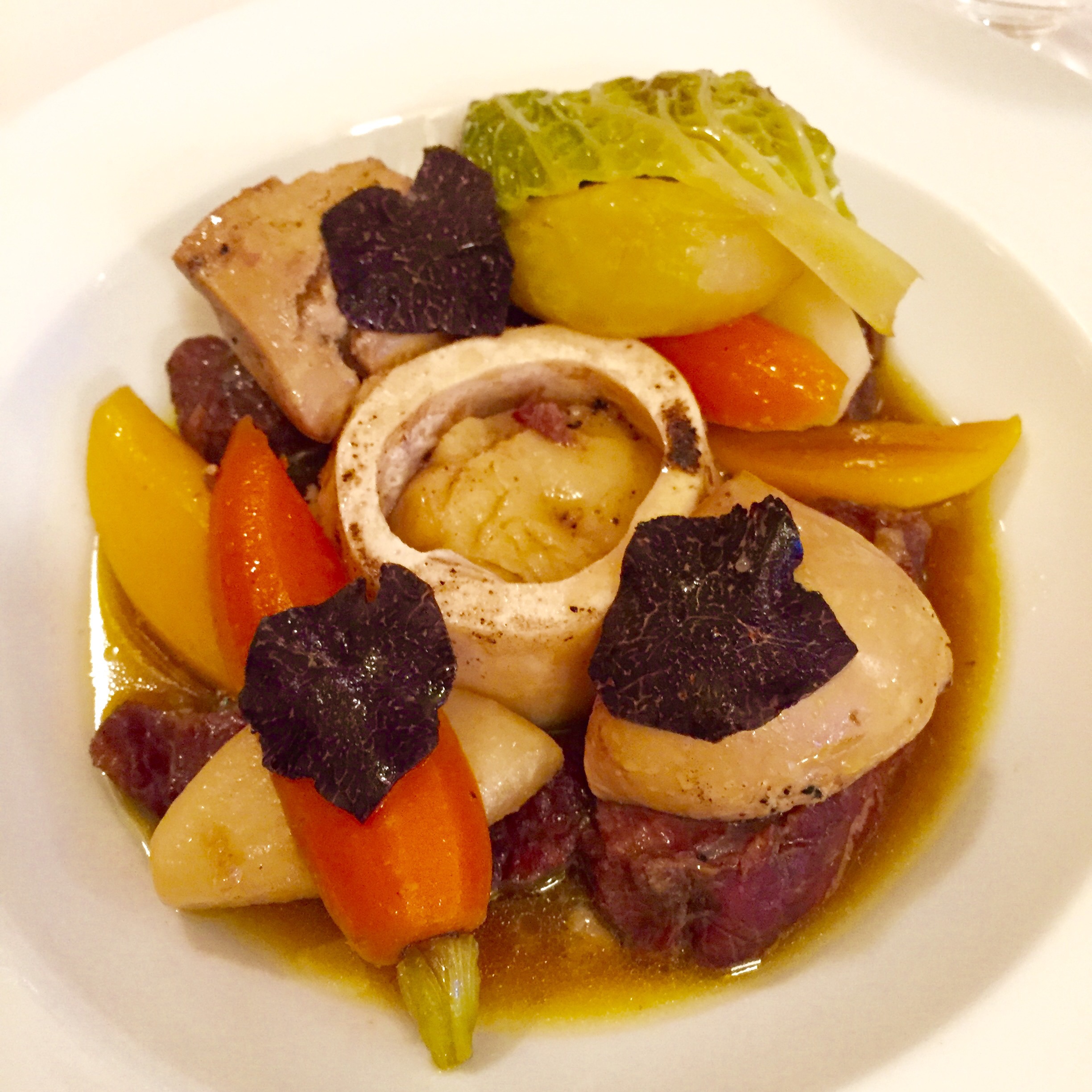 Para quien no lo sepa el pot au feu es el gran cocido francés, para muchos heredero de las ollas podridas. Este es mucho más lujoso porque incluye foie fresco y trufa negra. Comienza con una deliciosa y perfecta sopa de finísimos fideos. Perfecta por su sabor intenso y lleno de aromas y por la claridad del caldo totalmente exento de grasa.