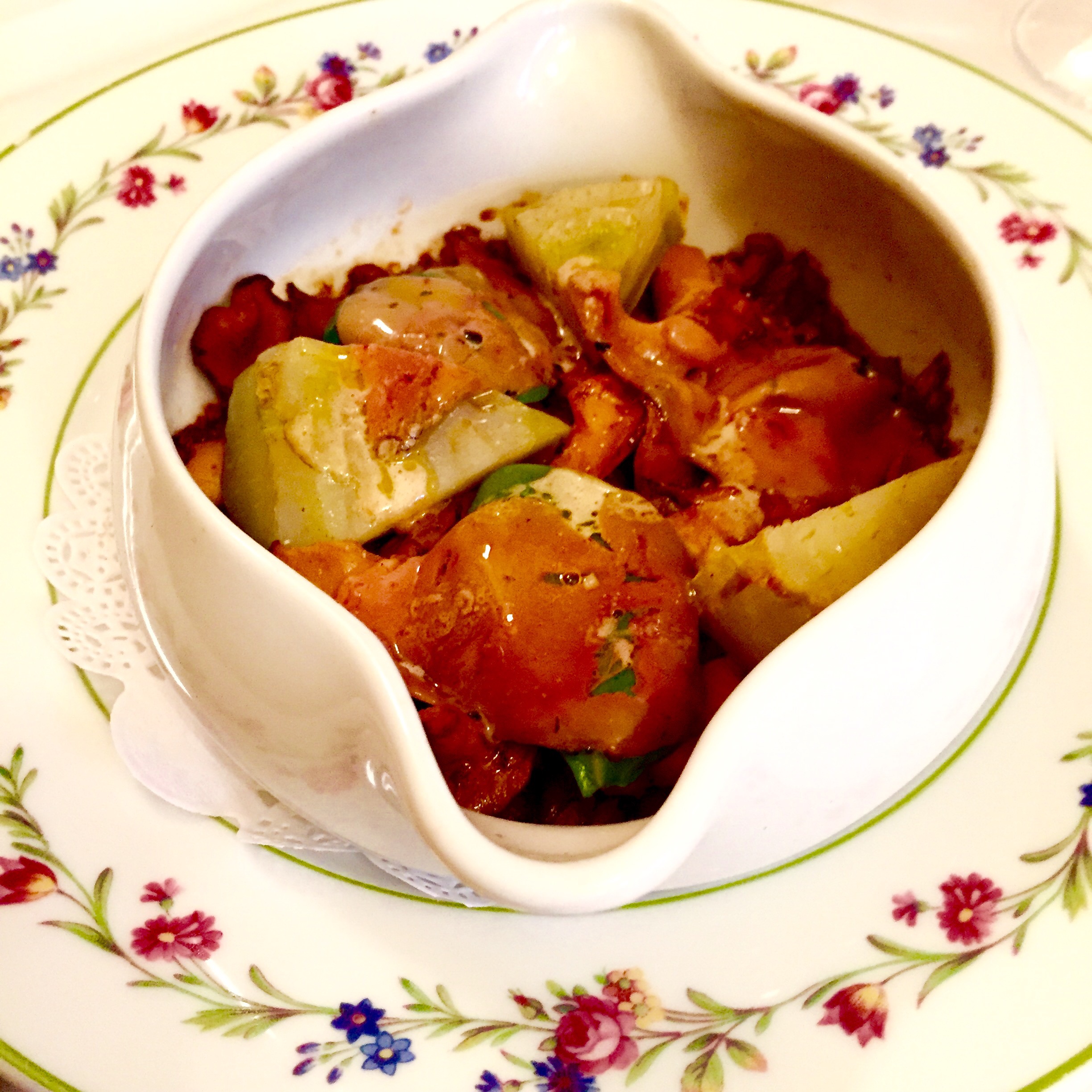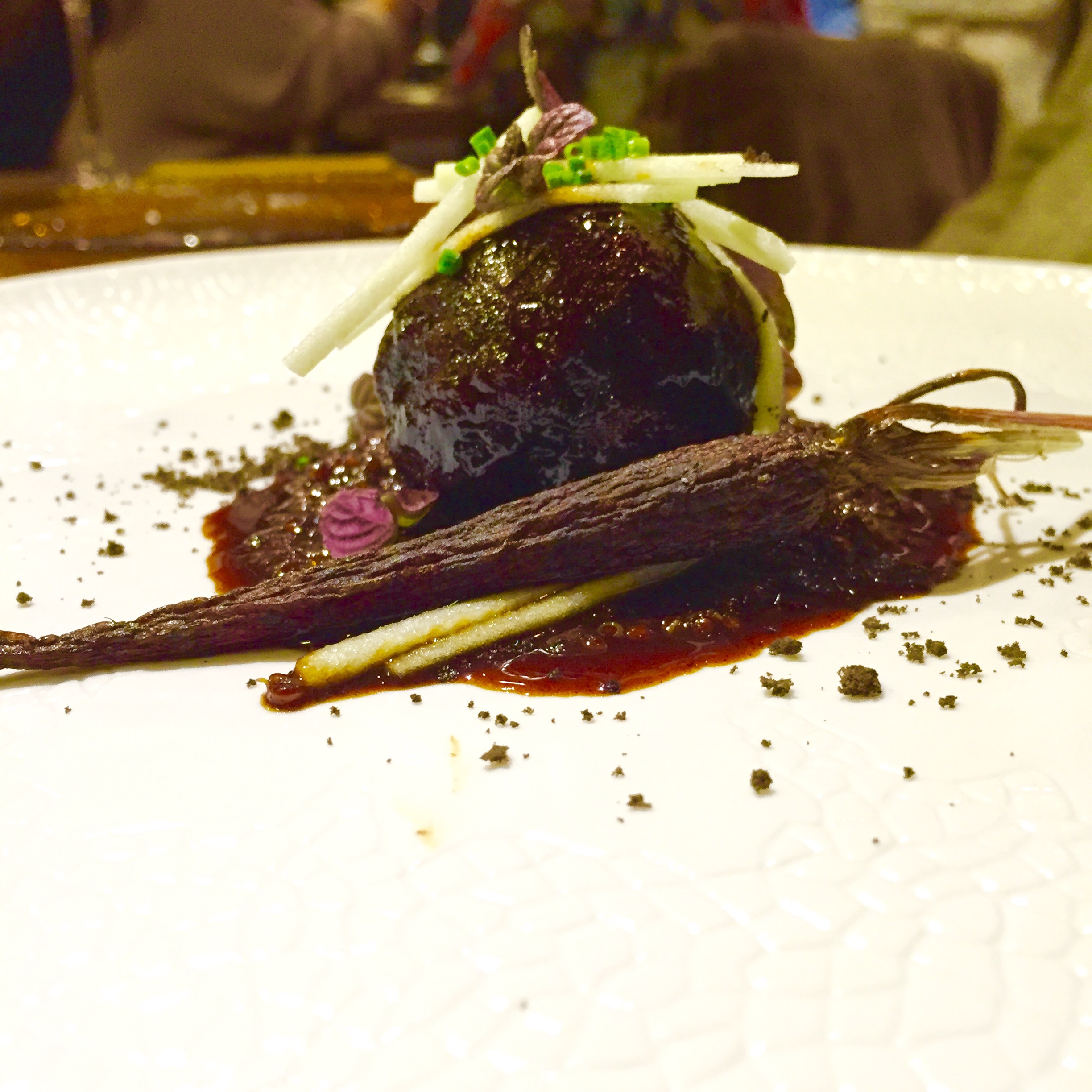 Continúa con un gran plato compuesto por verduras frescas que aligeran tiernísimos pedazos de buey, el tuétano y algunas porciones de suculento foie, coronado por las codiciadas láminas de la mejor trufa negra.