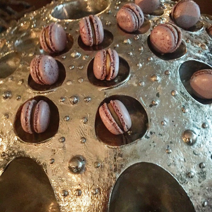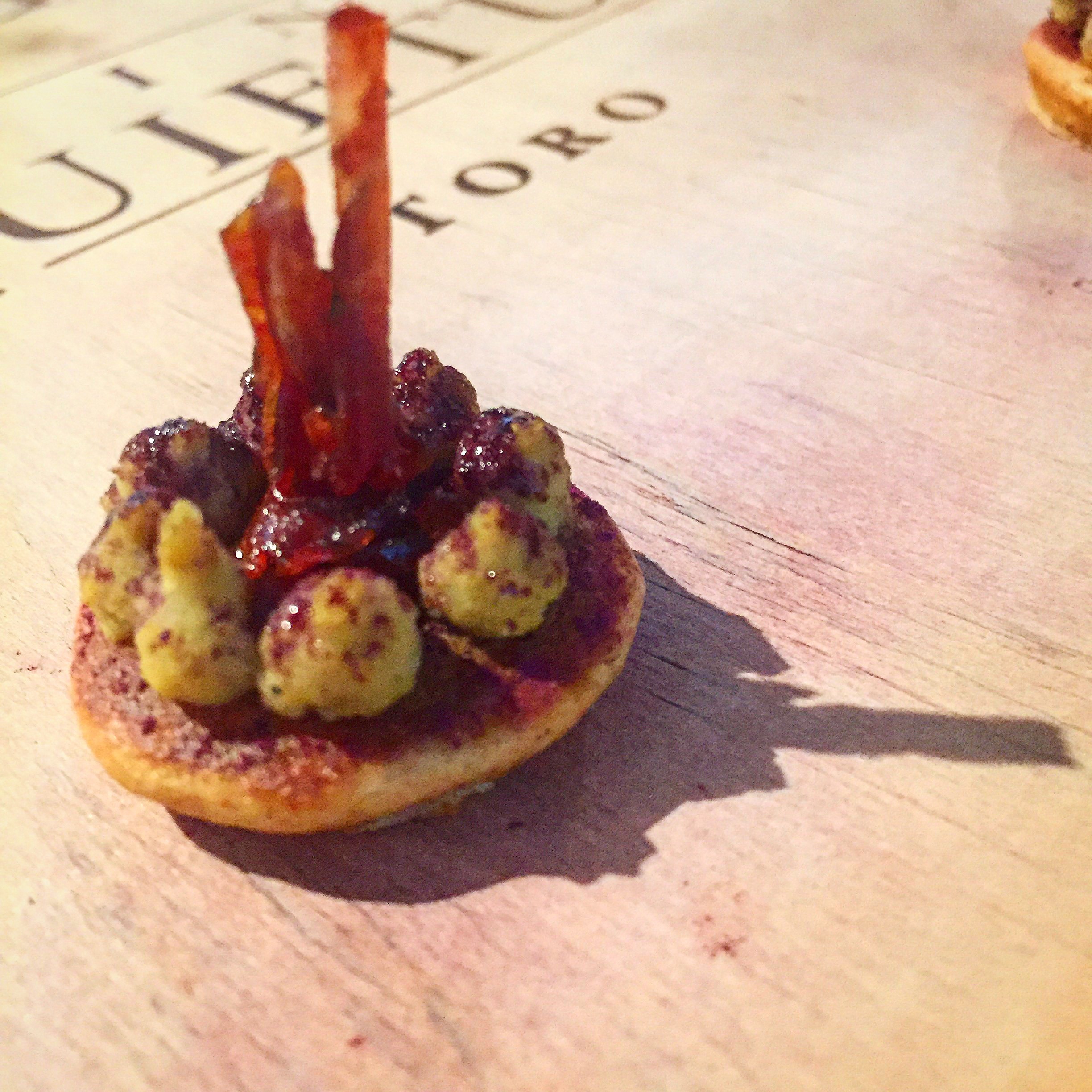 Antes, hemos tomado de una extraña estructura plateada, el único bocado que no se sirve en caja de vino, el macarron de Merlot con torta del Casar.