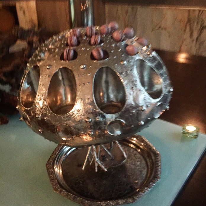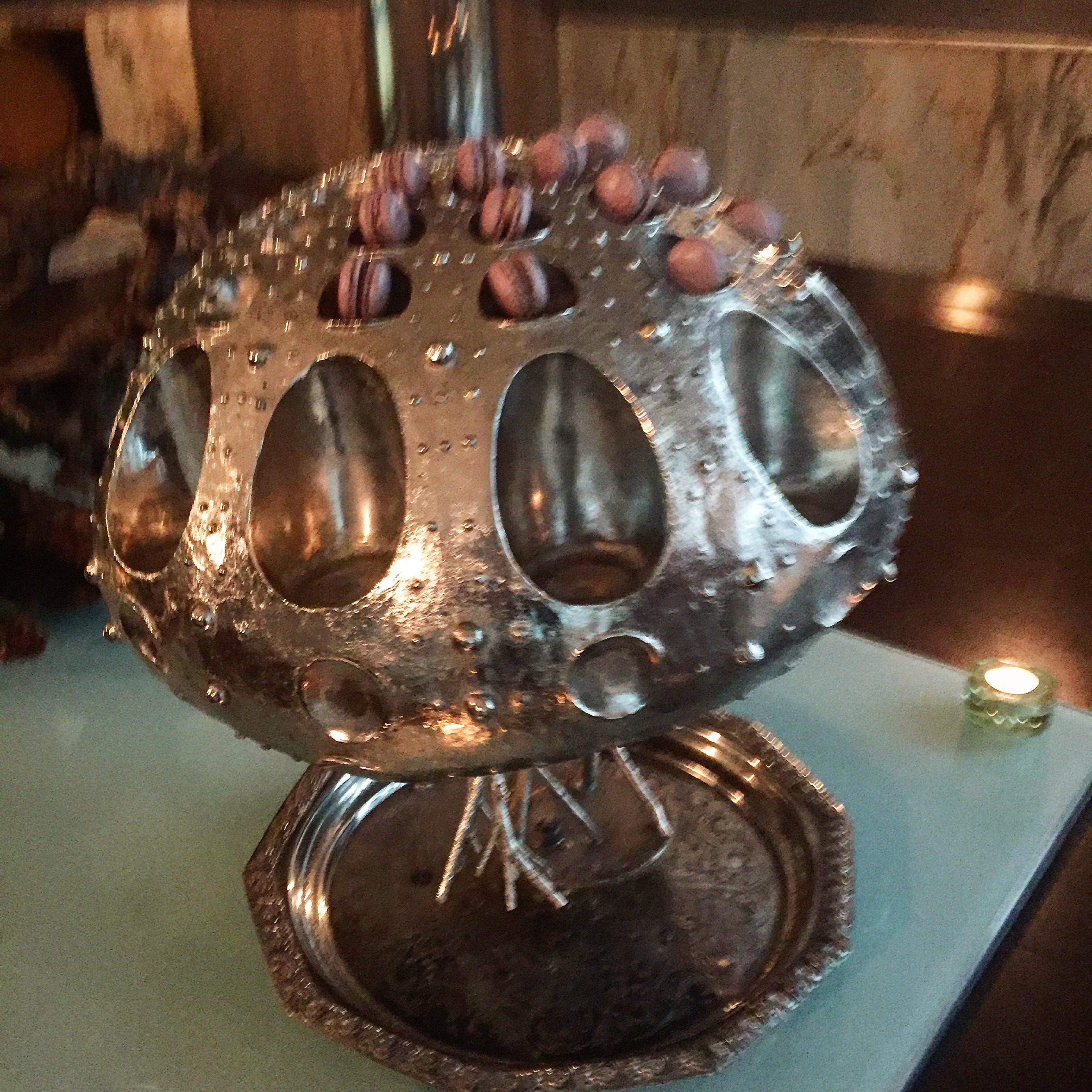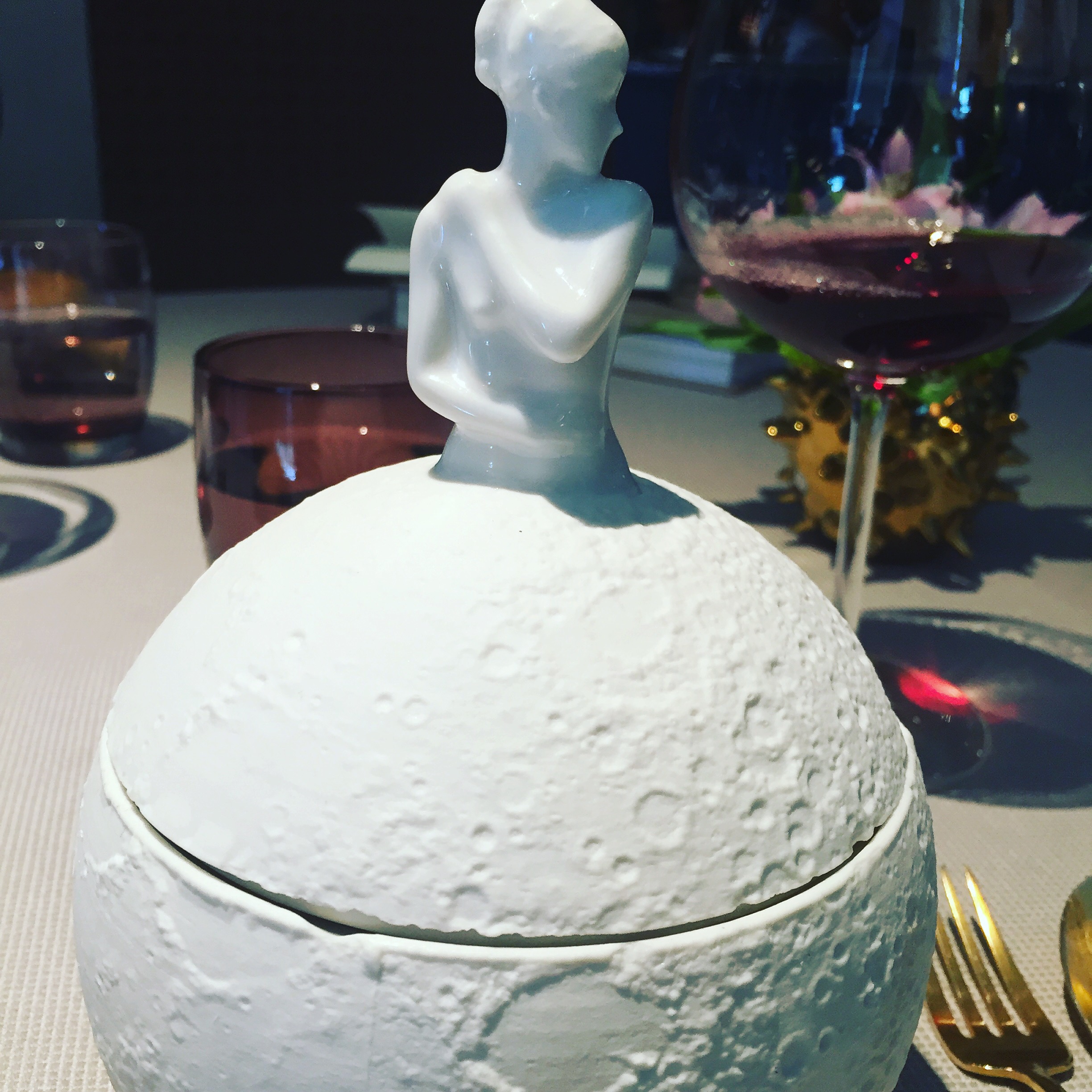 Las mignardises llegan como pequeñas gemas en un soporte de plata y más parecen orfebrería que gastronomia. El árbol de plata recuerda al coralino donde los Roca sirven los aperitivos. Y es normal ese recuerdo porque si la de los sublimes Roca es cocina ampurdanesa pura, mejorada por la del mundo entero, la de Sandoval es madrileñismo cosmopolita; pero con una gran diferencia y es que él Ampurdán siempre fue mar y tierra, opulento y toscano, mientras nuestro Madrid era, como alguien lo llamó, un poblachón manchego, sometido a sequías bíblicas y azotado por fríos y calores inacabables, una tierra orgullosa pero pobre y con una alimentacion de pura subsistencia, por lo que hacer de ella alta cocina parece más milagro que esfuerzo. Será por eso que dudo si convertir mi Santísima Trinidad de cocineros madrileños en tetrarquía o dejarla incluso en monarquia, porque Roncero es universal, Freixa catalán y Dabiz Muñoz oriental. Solo Sandoval es madrileñidad