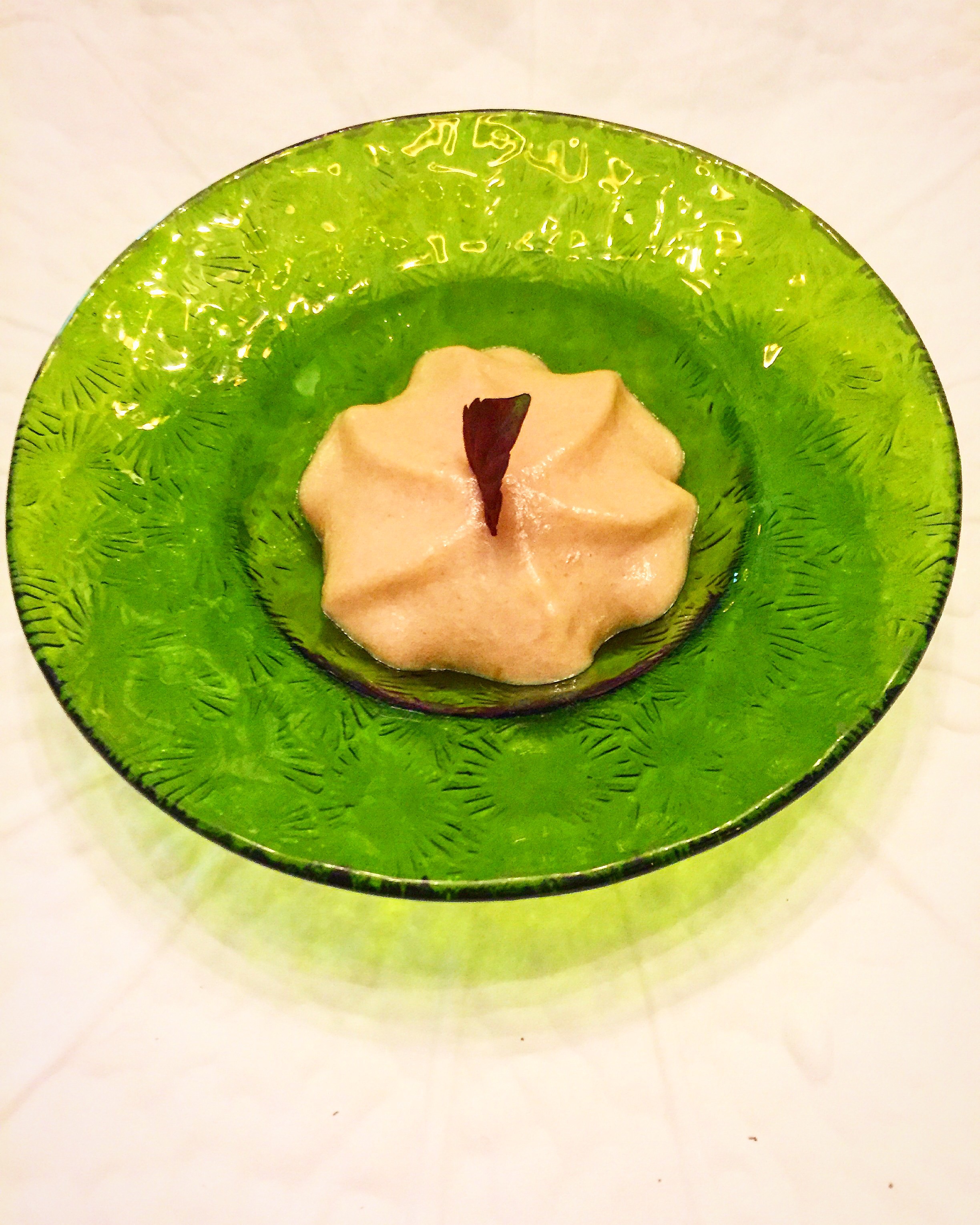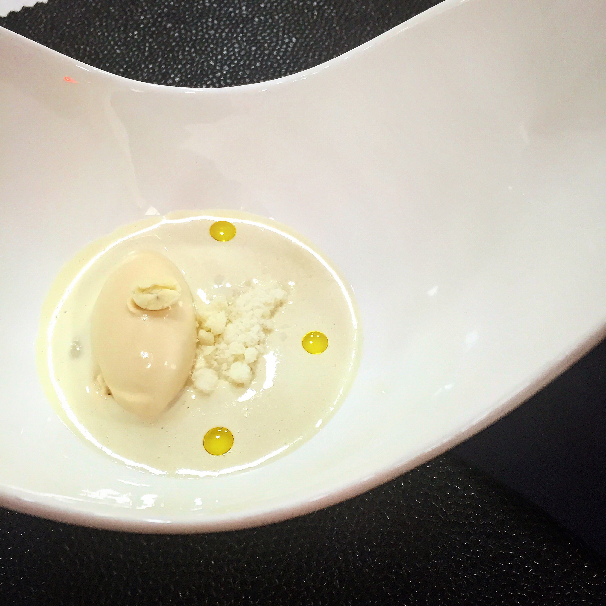 Él nos ofrece el primer gran bocado del almuerzo, una enorme creación a partir de la sencillez de un ajoblanco, sencillo, pero también uno de los mayores platos de la cocina española. La particularidad de este es que es de piñones y se llama, piñón hidrolizado con helado salado y extracto de su aceite. Quiere decir que de un simple piñón extraen agua, aceite, leche y dos tipos de pasta y con todo eso, pero con nada más, se elabora este prodigioso plato.