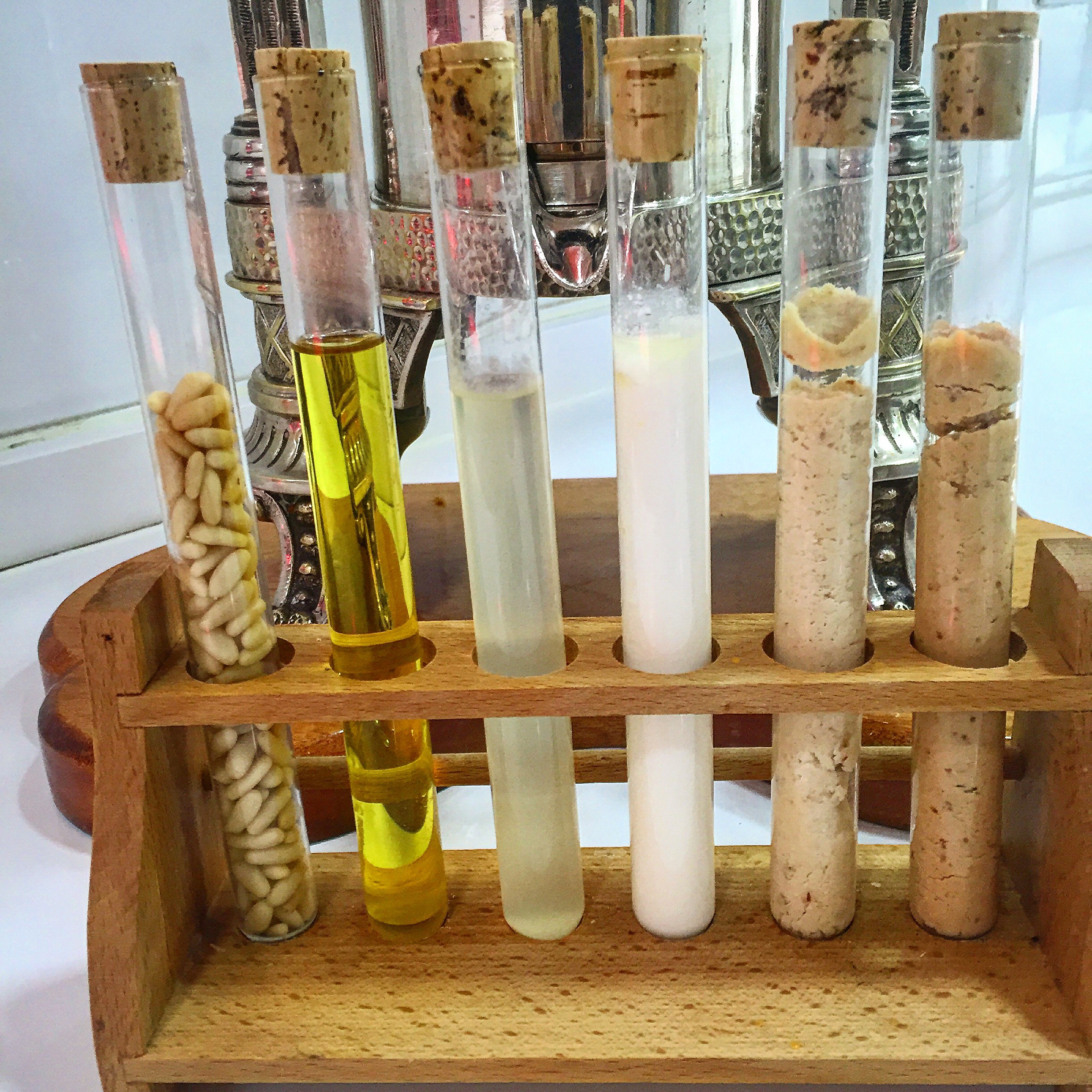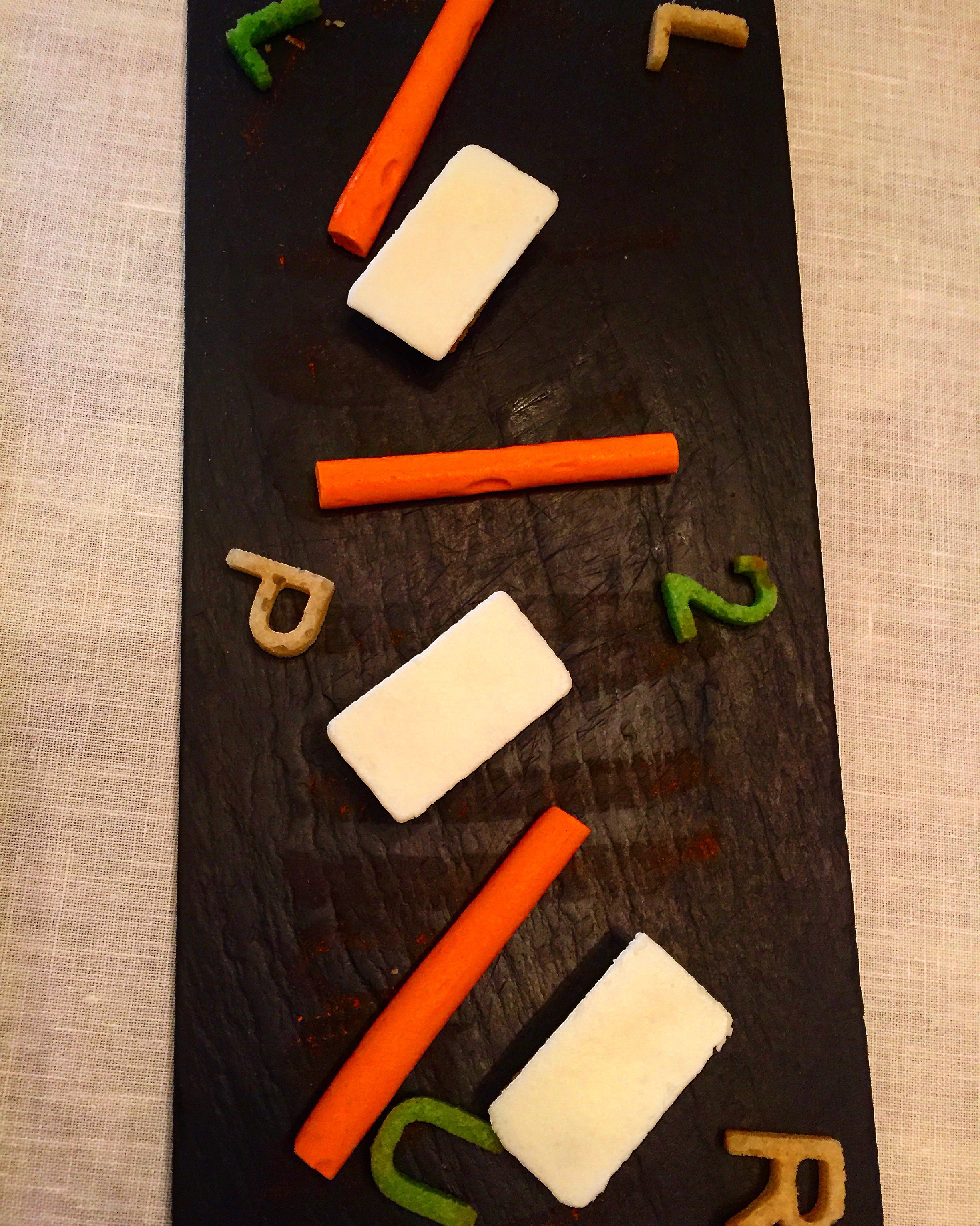 Siguen semillas de verduras asadas y encurtidas con especias de los cinco continentes, una propuesta elegantemente presentada, muy viajera y original, en la que tomates, calabacines y pepinos se mezclan con especias de todo el mundo entre las que destacan el azafrán o el ras el hanout.