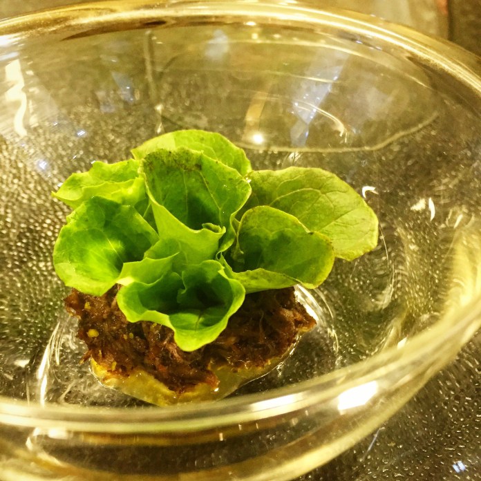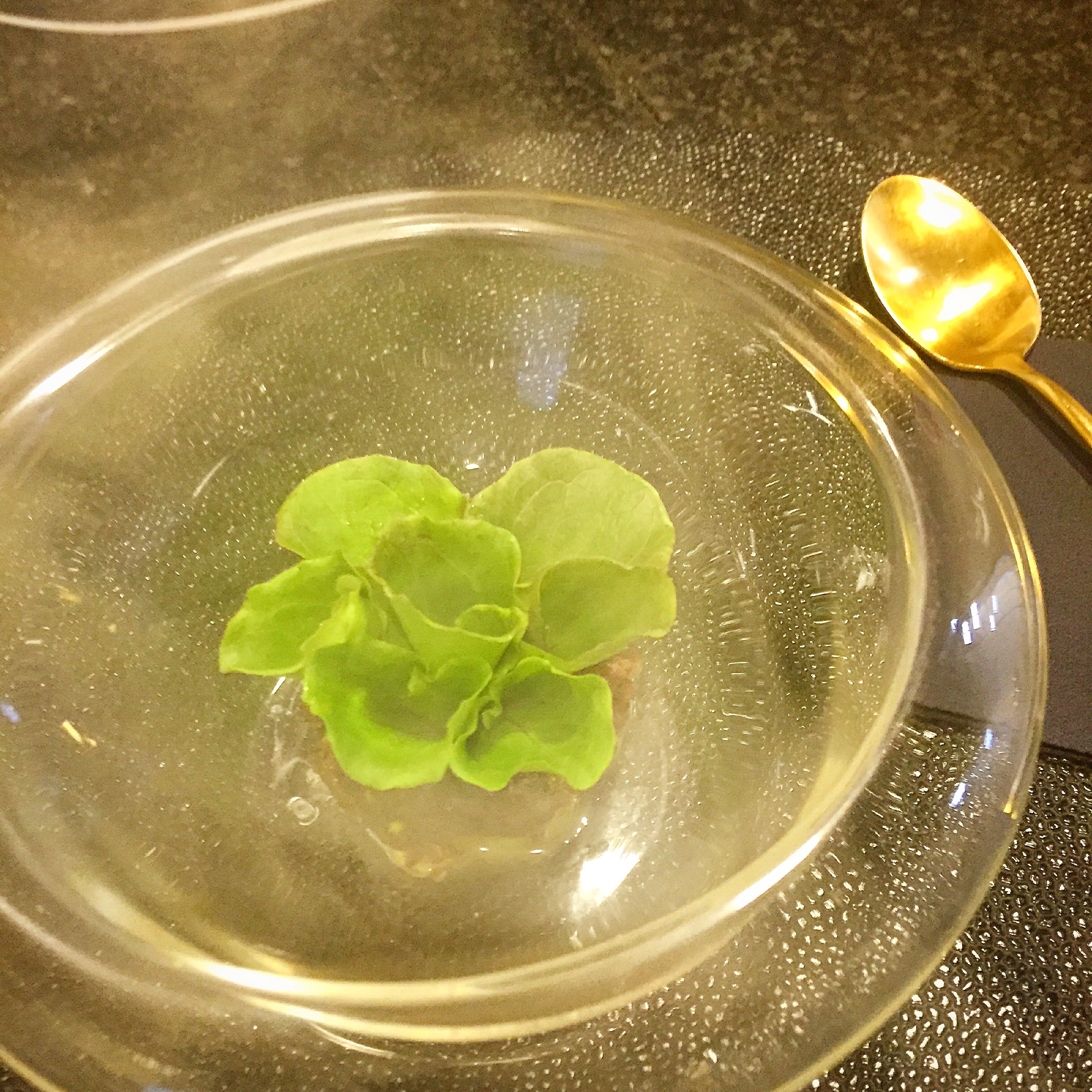 En la zona de los hornos, para los que usan tres tipos de leña, una campana de cristal esconde, entre humos aromáticos, la lechuga Batavia ahumada y estofado de ternera con polifenoles de vino, un bello huerto que mezcla el frescor de la lechuga tierna con la fuerza de la carne.
