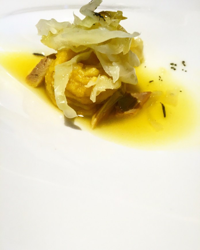 El ravioli meloso de toro bravo y tendones con higos y jugo de cochinita picante es un plato recio como los que se hacían en la meseta en tiempos de penuria y calores de secarral. En esta versión sofisticada pero fiel, se aprecia toda la fuerza del toro combinada con la suavidad de un ravioli lleno de sabor y aromas que se deshace en la boca.
