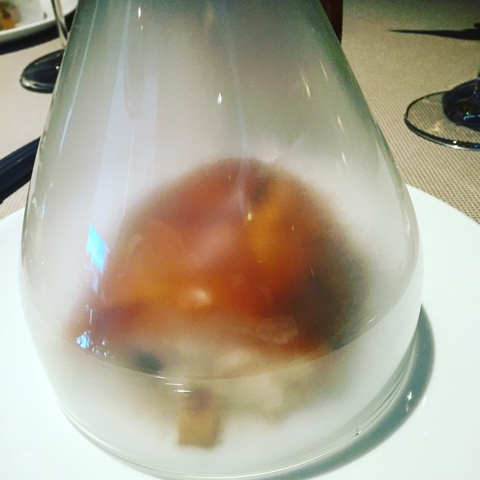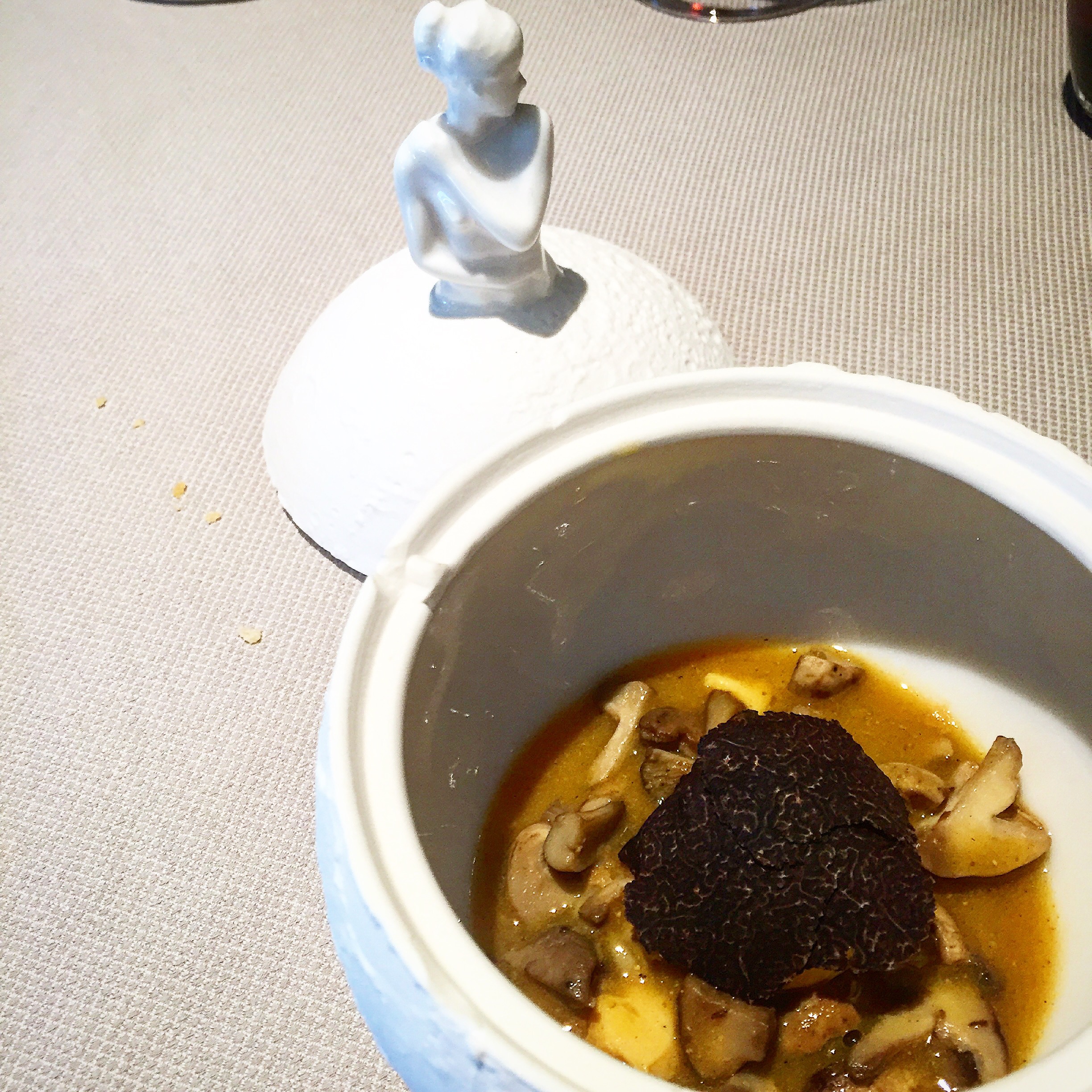 El paso al comedor es duro porque, tras tantos placeres, hay que enfrentarse a su penumbrosa fealdad. Menos mal que pronto resurgen los manjares sandovalianos: un delicioso pan al vapor con guiso de ternera y mostaza picante (otra vez el gran juego de sutileza y potencia) acompañado de un intenso consomé de carne y setas al Armagnac.
