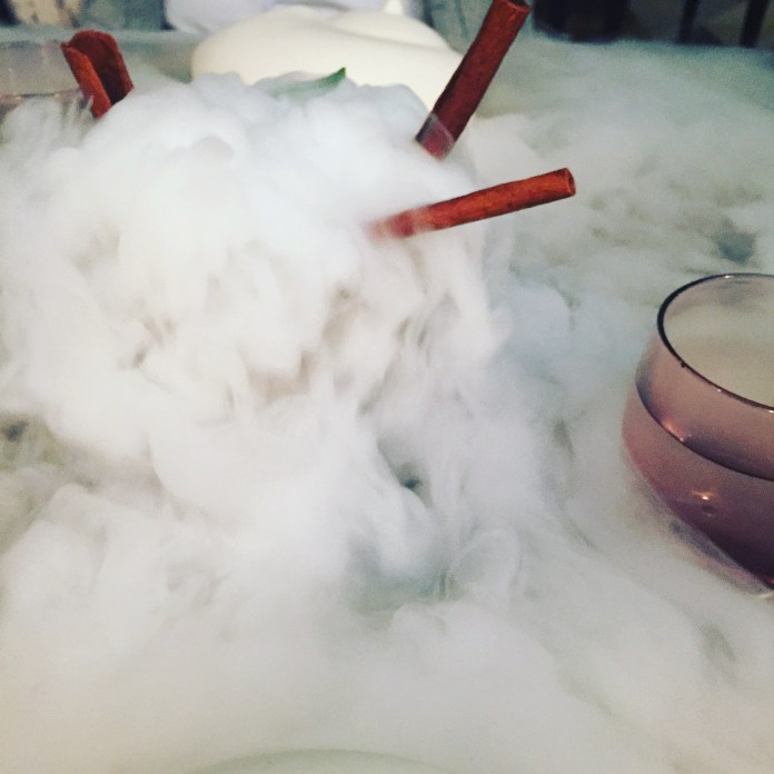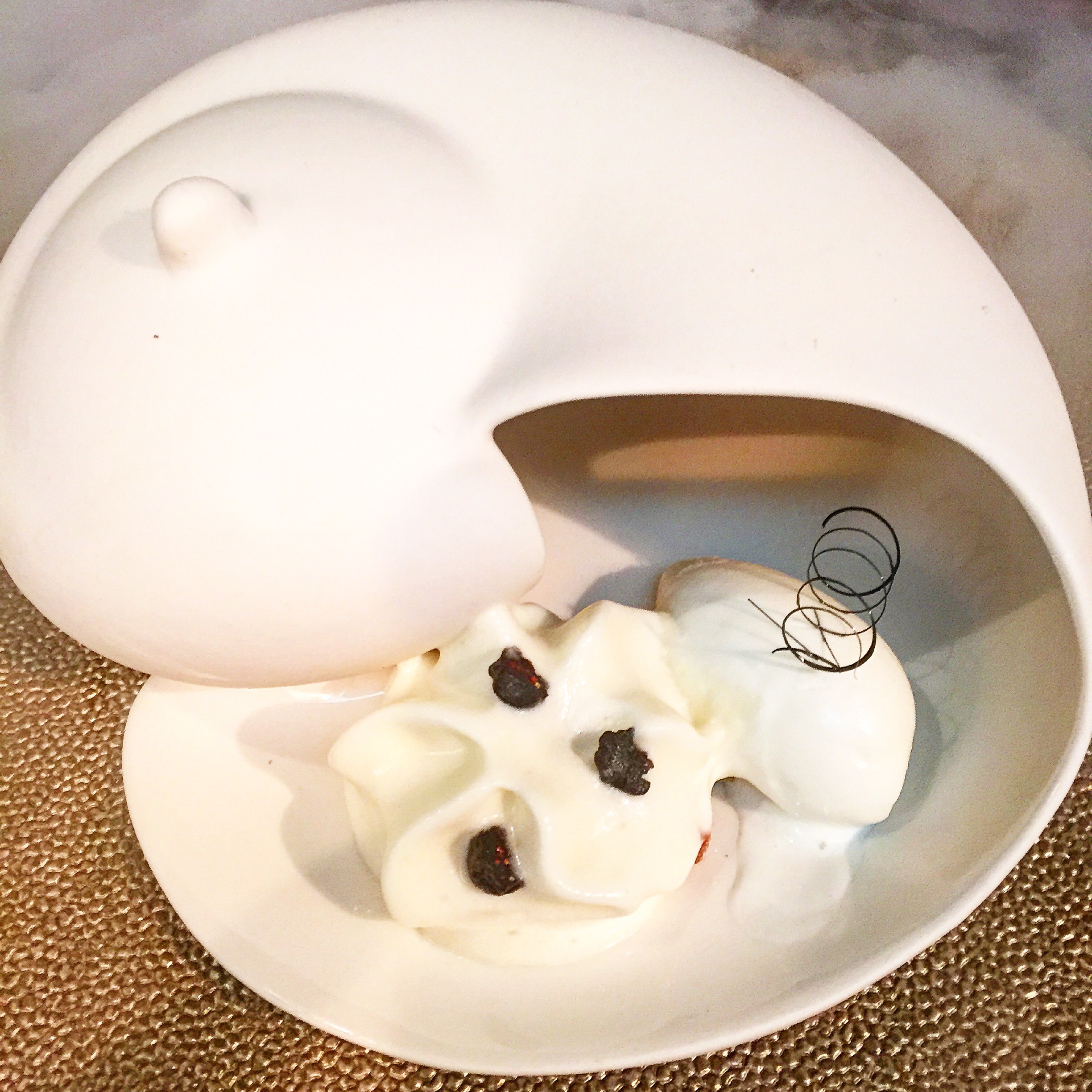 Allí se vuelve a la belleza del blanco por el que se empezó (el ajoblanco y el pan al vapor) y que nos siguió hasta el final en muchos de los recipientes o en las inmaculadas carnes del cochinillo. Todo es blancor en el delicioso e intenso yogur ácido de oveja con arándanos y espuma de trebejo ahumada que se sirve entre humos que sacan fulgores aromáticos de palos de canela en una presentación efectista y espectacular.