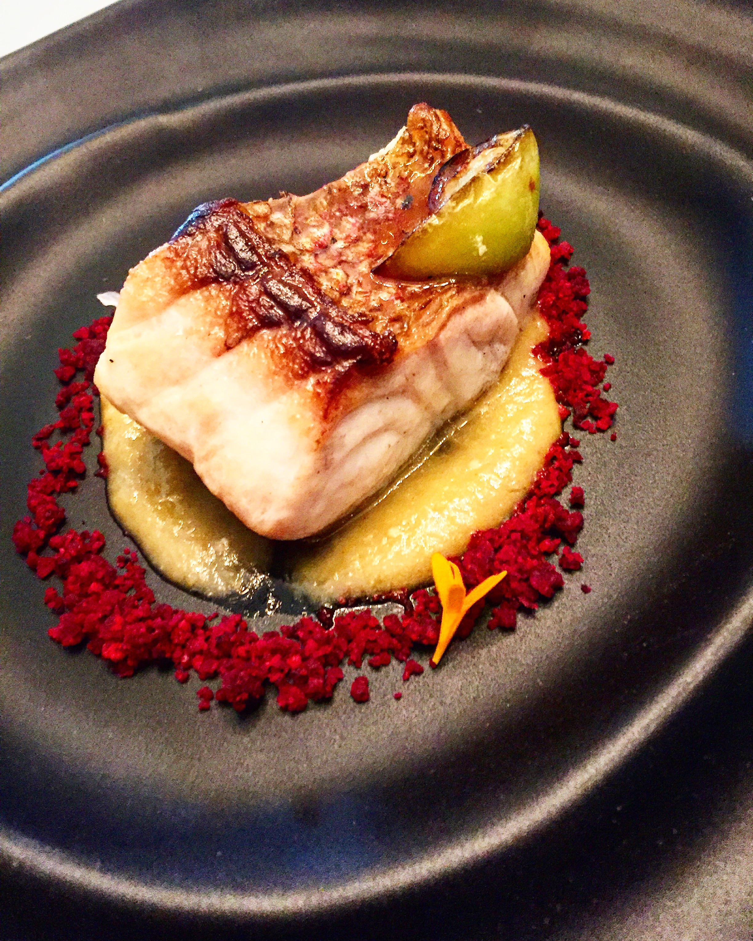 urta con migas de remolacha y escabeche de tomatillo, otro plato que mezcla texturas y crujientes y melosas con los sabores dulzones de las hortalizas más dulces.