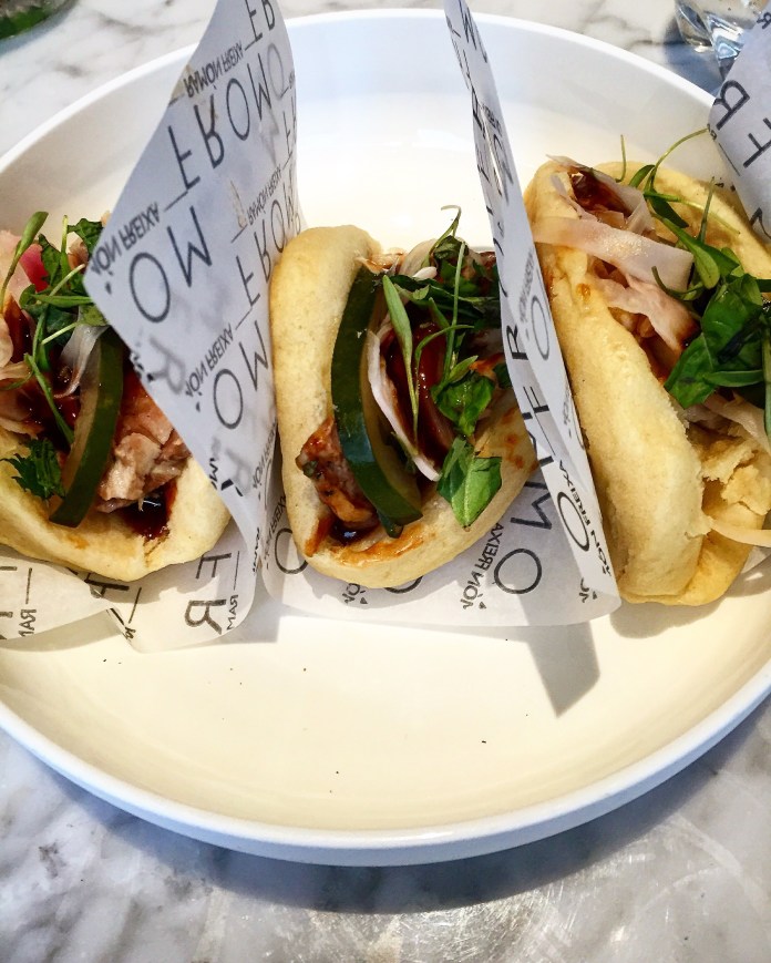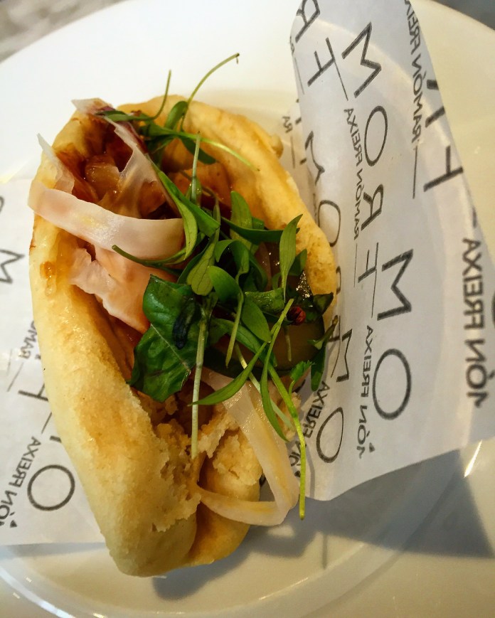 La carta es larga y pensada para un público de todos los gustos, tan variada que aquí se puede venir casi cada día: muchos aperitivos y platos para compartir, tartares, carpaccio, tiradito, pastas y pizzas, dos arroces y, naturalmente, una buena oferta de carnes y pescados, pero todo, hasta lo más simple, con ese toque de gran técnica, modernidad y altísima cocina que impregna hasta la obra más popular de Ramón Freixa. Y es que quien puede lo más también puede lo menos y él es especialista en este tipo de ofertas. En Madrid arrasan por ejemplo, las de Arriba y Ático. Empezamos con el pan al vapor relleno de pork belly, hoisin de fresa y encurtidos un bocadillo oriental sumamente original en el que el bollo tiene una masa demasiado gruesa mientras que el relleno es sumamente sabroso y chispeante.