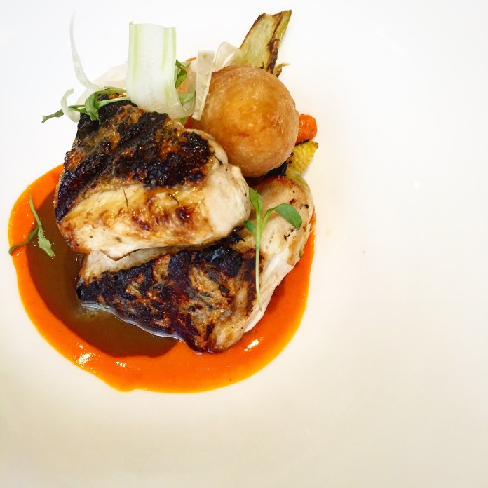 La pesca del día con carimañola de langostinos, vegetales eco y curry es otra buena opción. En este caso el pescado era mero. No es como el del mismo nombre que comemos por estos lares pero tiene calidad y delicadeza. Las verduras son de gran calidad y la carinañola un acompañamiento estupendo y muy colombiano porque este pastel de yuca relleno generalmente de carne y en este caso de langostinos, es plato nacional.