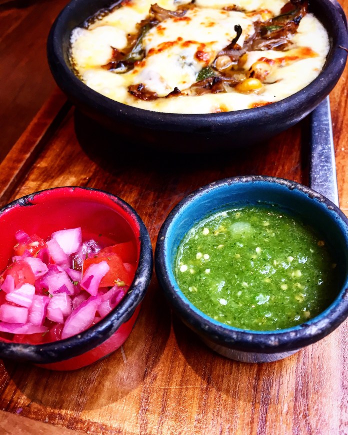 La cazuelita de rajas de chile poblano, queso fundido, xnipec de cebolla morada y salsa de chile habanero no debe asustar -a pesar de contener este último tipo de chile famoso por su fiereza-, especialmente cuando se viene del plato anterior. Estas cazuelitas mezclan el queso fundido con muchas cosas y, aunque siempre resultan bastante grasas, la absorbente tortilla de maíz que acompaña a estos platos puede con todo.