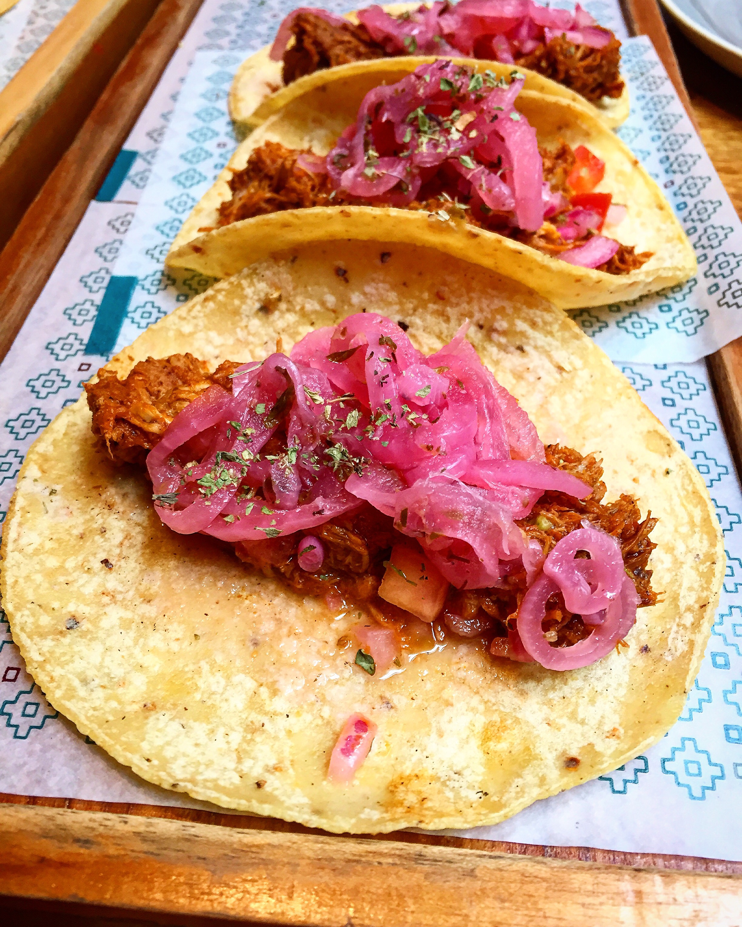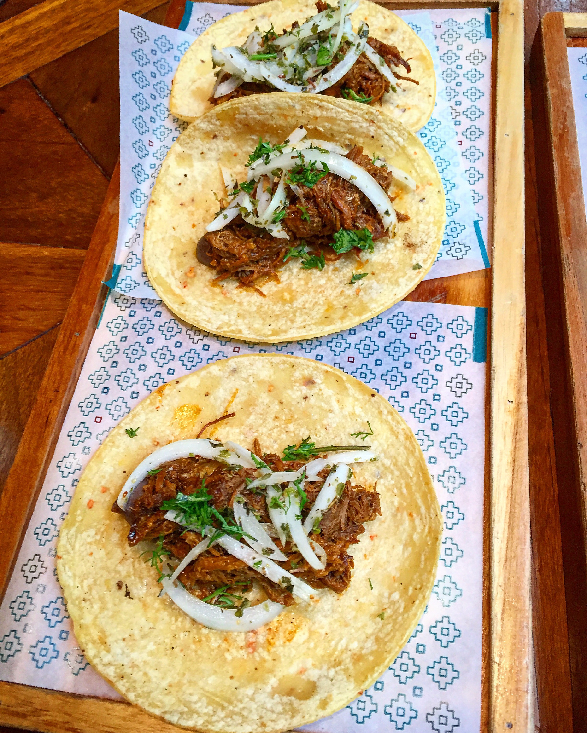 Ya adelanté que hay múltiples variedades de taco. Los aconsejo, para los no muy expertos enrollando tortillas, porque ya vienen preparados como en la foto y tan solo hay que comerlos. Sin mayores complicaciones. Me gustan especialmente el de cochinita pibil, xnipec y cebollas moradas encurtidas y el de chilorio, frijol refrito y cebolla bruja. El primero porque la cochinita pibil es un delicioso plato del Yucatán a base de cerdo guisado y adobado en una deliciosa especia llamada achiote y el de chilorio, típico de Sinaloa, porque junta magistralmente esta carne desmenuzada con con chile pasilla, ajo, comino y orégano. Ambos están deliciosos.