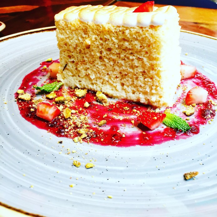 Siempre digo que la repostería no es lo mejor de la cocina mexicana pero también que tiene algunos deliciosos postres como este enorme pastel de tres leches que a pesar de su aspecto aterrador (por su tamaño) resulta suave y fresco por estar embebido en esas tres leches (condensada, evaporada y crema) y erigido -mejoras del chef- sobre un perfecto pedestal de frutos rojos.