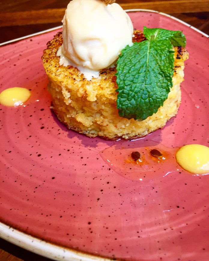 La tarta de elote (maíz) también tiene sus mejoras: un crocante de caramelo que la enriquece y salsa y helado de maracuyá que le aportan frescor y ligereza.