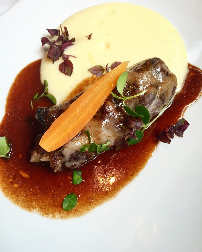 Lo que no hace falta españolizar, porque son más españolas que las castañuelas o el Hola, son las manitas rellenas de rabo de toro estofado y parmentier de patata. A mí esto de las manitas siempre me ha dado bastante repelús pero usar su gelatinosidad para envolver un delicioso guiso de rabo de toro resulta una idea excelente y el toque de la piel crujiente rematando cada medallón, una delicia que hay que probar. Tanto que hace olvidar la guarnición, demasiado facilona, del puré de patata aunque, pensándolo bien, ni siquiera hace falta comérselo y el contraste de dorados, ocres y amarillos resulta muy vistoso.