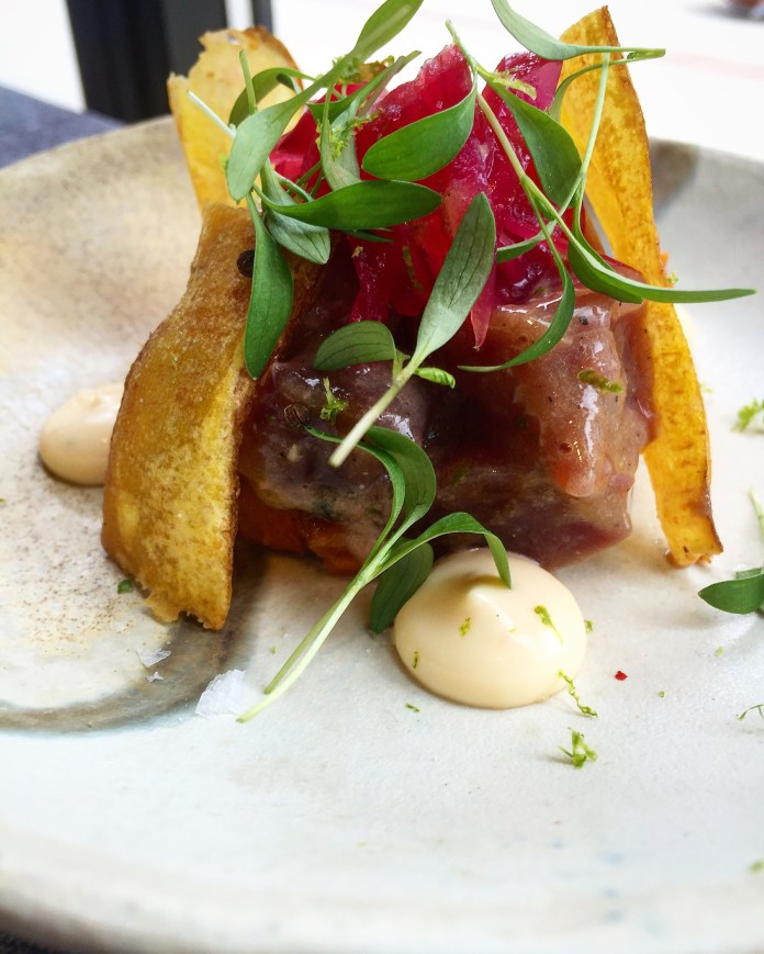 Uno de los grandes méritos de César Martín, este gran cocinero, es que domina muchas cocinas y las usa y mezcla con inteligencia y sin exageración. El ceviche de atún rojo con mayonesa de rocoto, cilantro y cebolla encurtida se asienta en una base de puré de boniato y es una gran mezcla de picantes y dulces con el toque crujiente del plátano, una sabia combinación que respeta el perfecto sabor de un atún excelente con el que viajamos a Perú, solo con el paladar.
