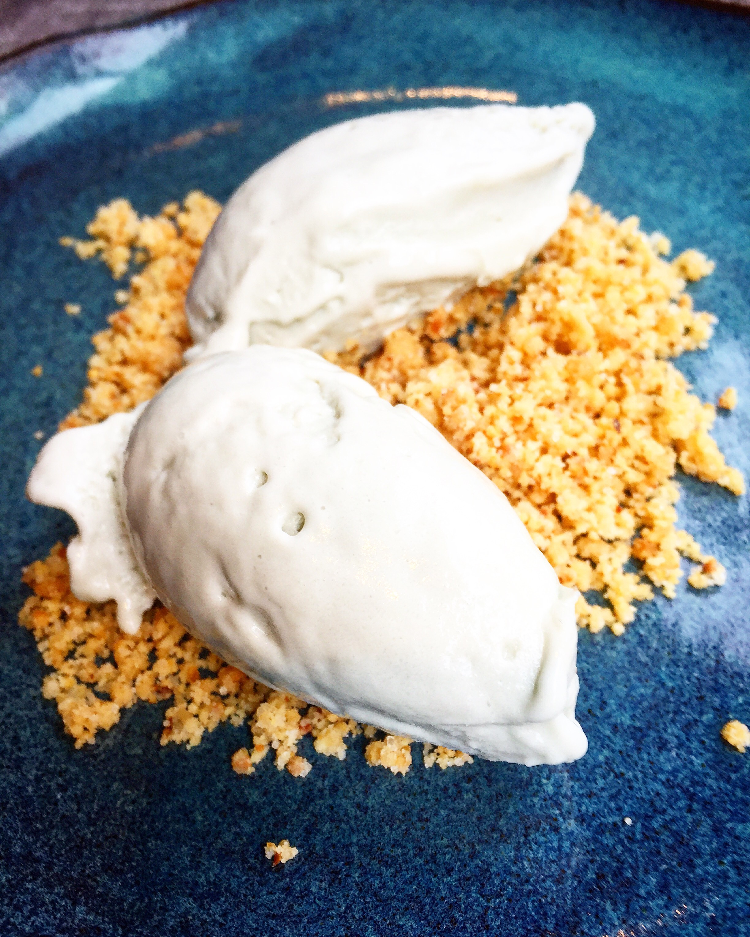 Ya no hay, espero que temporalmente, tarta de queso. Era una de las mejores de Madrid porque se atrevían con los más fuertes y la elaboraban con quesos intensos. La ha sustiuido, muy bien eso sí, el helado de queso azul que se puede comer con o sin migas de galleta. Con ellas estaba realmente bueno porque la galleta semisalada le hace un postre tan distinto que también puede ser una guarnición o una entrada.