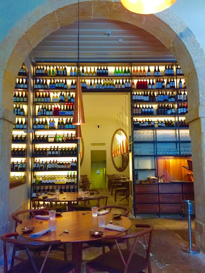 Manteniendo los suelos de piedra rústica, los imponentes arcos y la rugosidad de las paredes, se ha decorado con sencillez y con tan solo un puñado de adornos: espejos que lo agrandan, un gran botellero que lo llena de chispas y pizcas de luz y dos grandes tapices blancos y rojos, como única nota de color. El aire semiindustrial se completa con mesas desnudas y una pequeña cocina abierta que se divisa desde algunas.