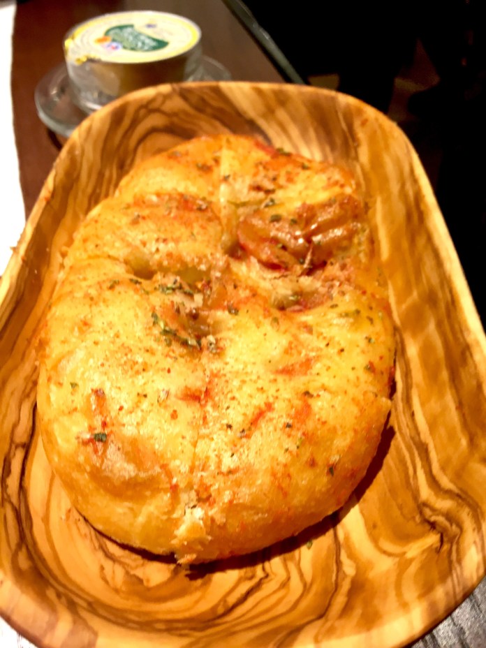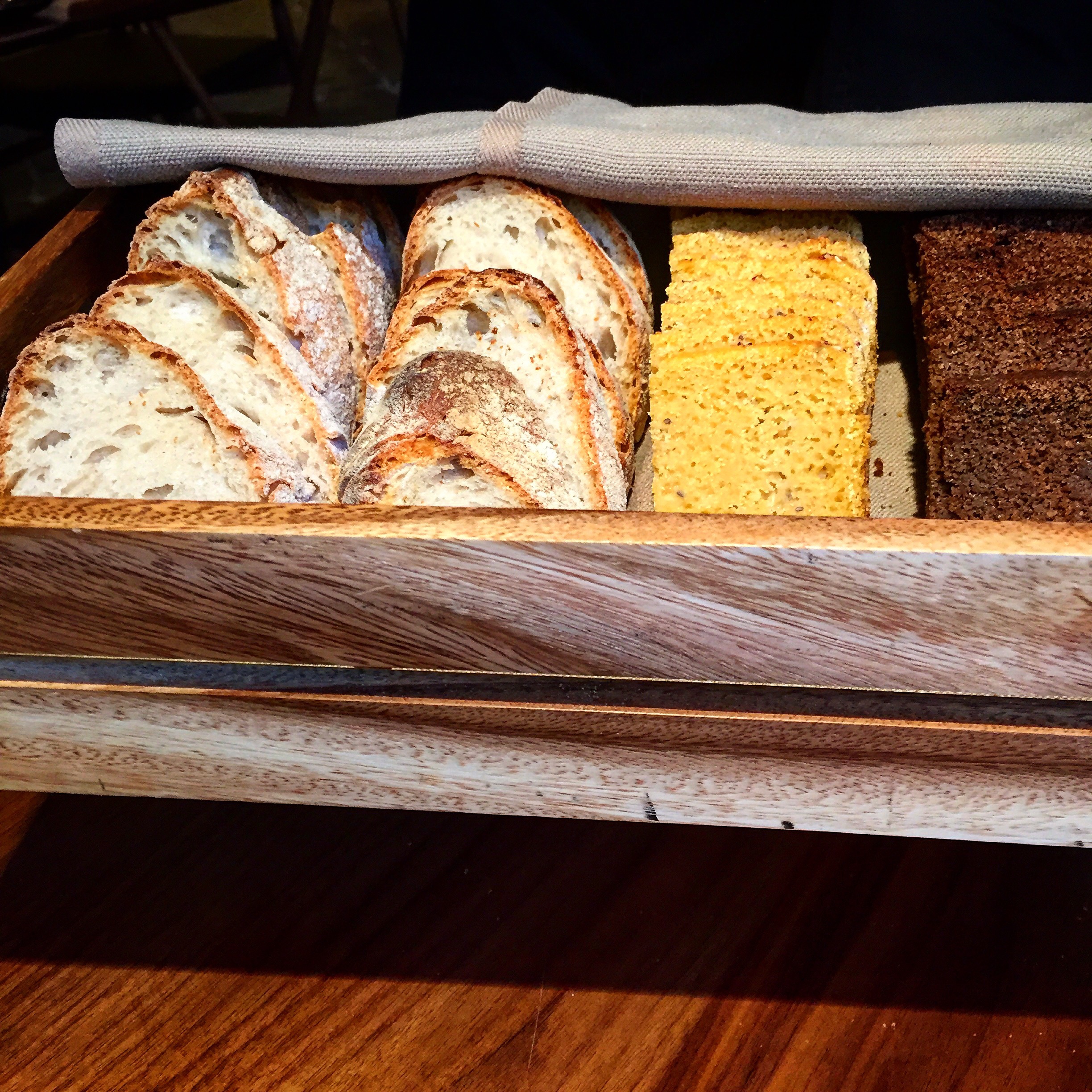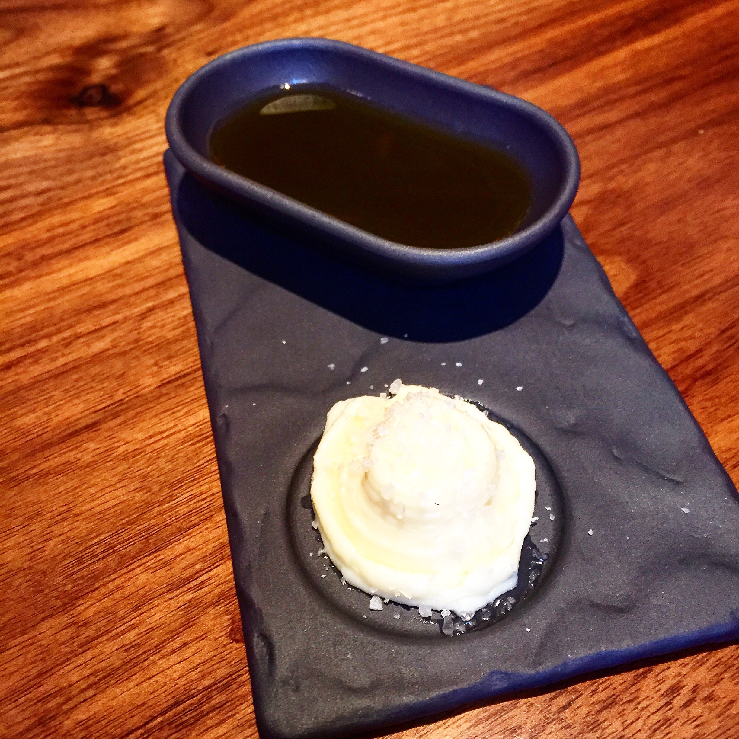 Empieza la comida con la mantequilla de sal ahumada, un buen aceite de Évora y tres tipos de pan: de Mafra, un clásico portugués, de maíz y patata dulce al que esta no añade nada y más bien empeora la clásica y excelente broa de milho y de algarroba, otra originalidad francamente olvidable.