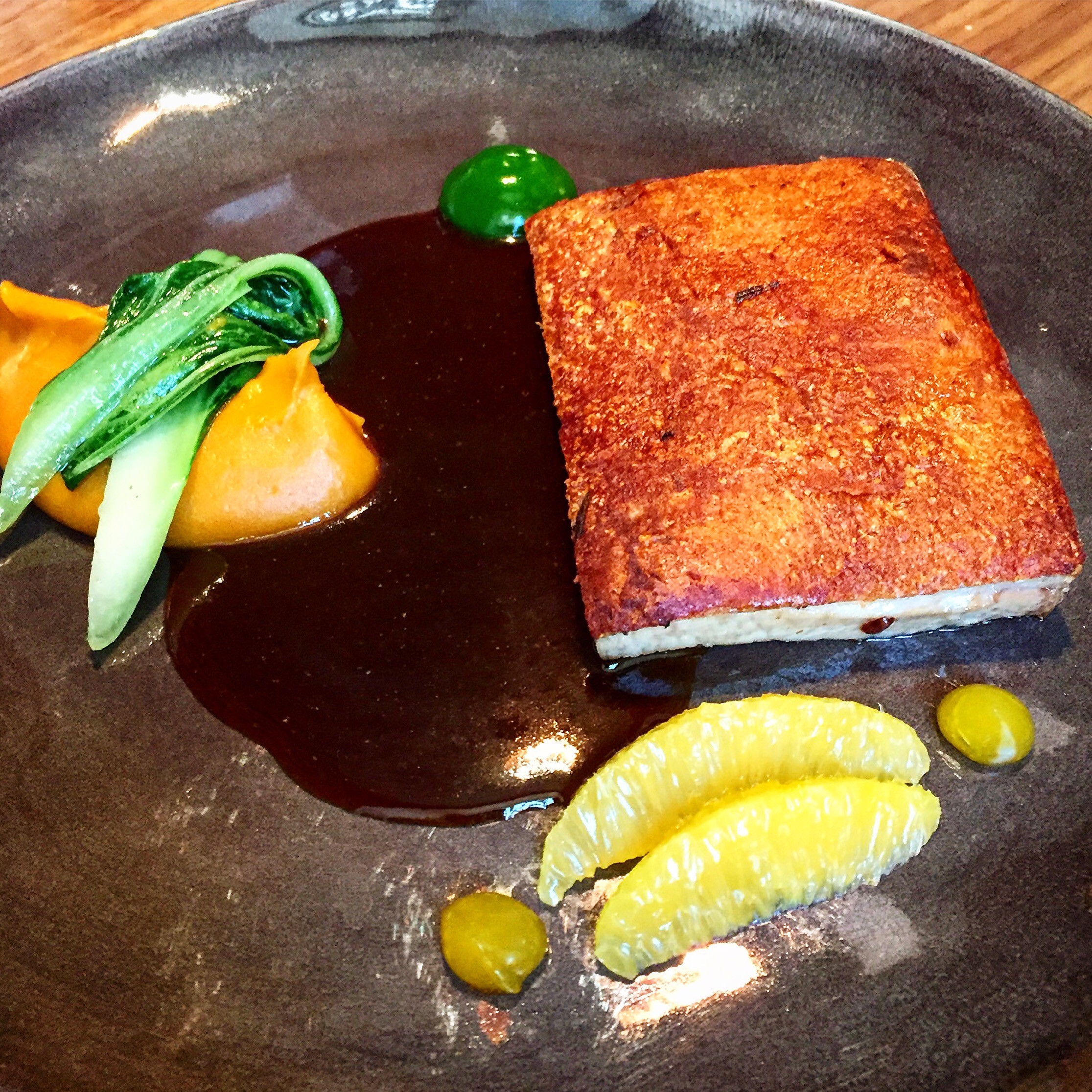 El cochinillo confitado está también asado a baja temperatura y la piel dorada y crujiente de modo perfecto. Se acompaña de los deliciosos jugos del asado perfectamente clarificados y desgrasados, un aromático puré de batata y romero, un toque de mantequilla de jengibre y algo de naranja, elementos todos que contribuyen a contrarrestar la inevitable dosis de grasa del cerdo.
