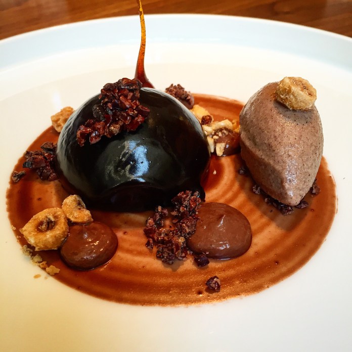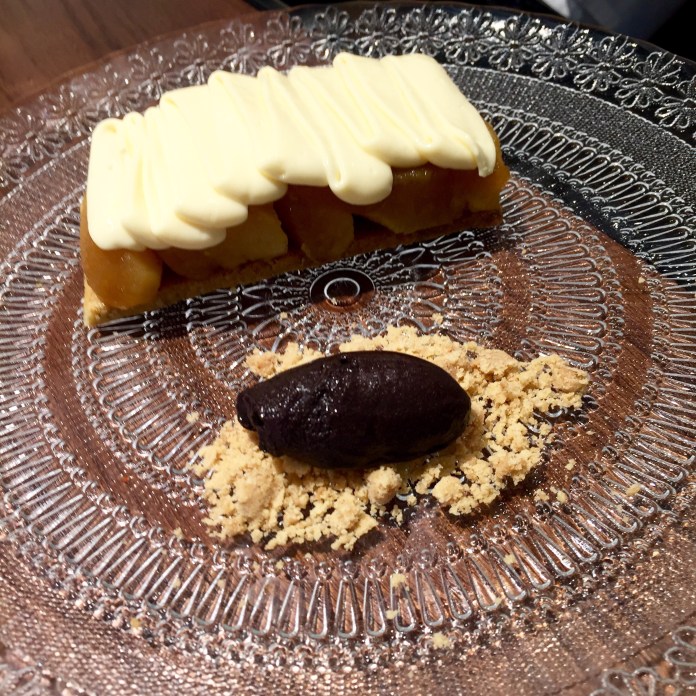 También el exceso de barroquismo impidió que me encantara la tarta de manzana porque, siendo muy bueno el relleno de grandes gajos de manzana ácida que la compone, el cremoso de chocolate blanco que la recubre no la mejora, como tampoco un buen chocolate negro helado que, siendo notable por sí solo, no es el mejor acompañamiento para una tarta de manzana.