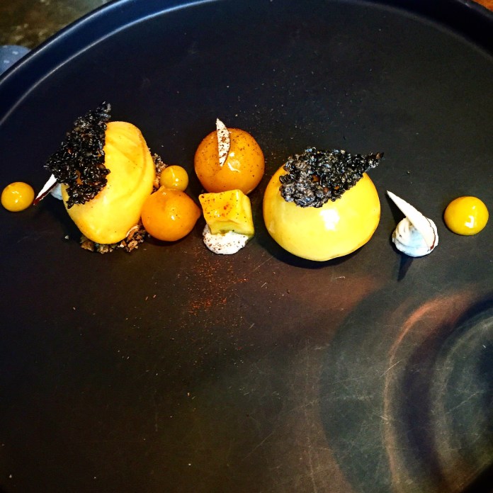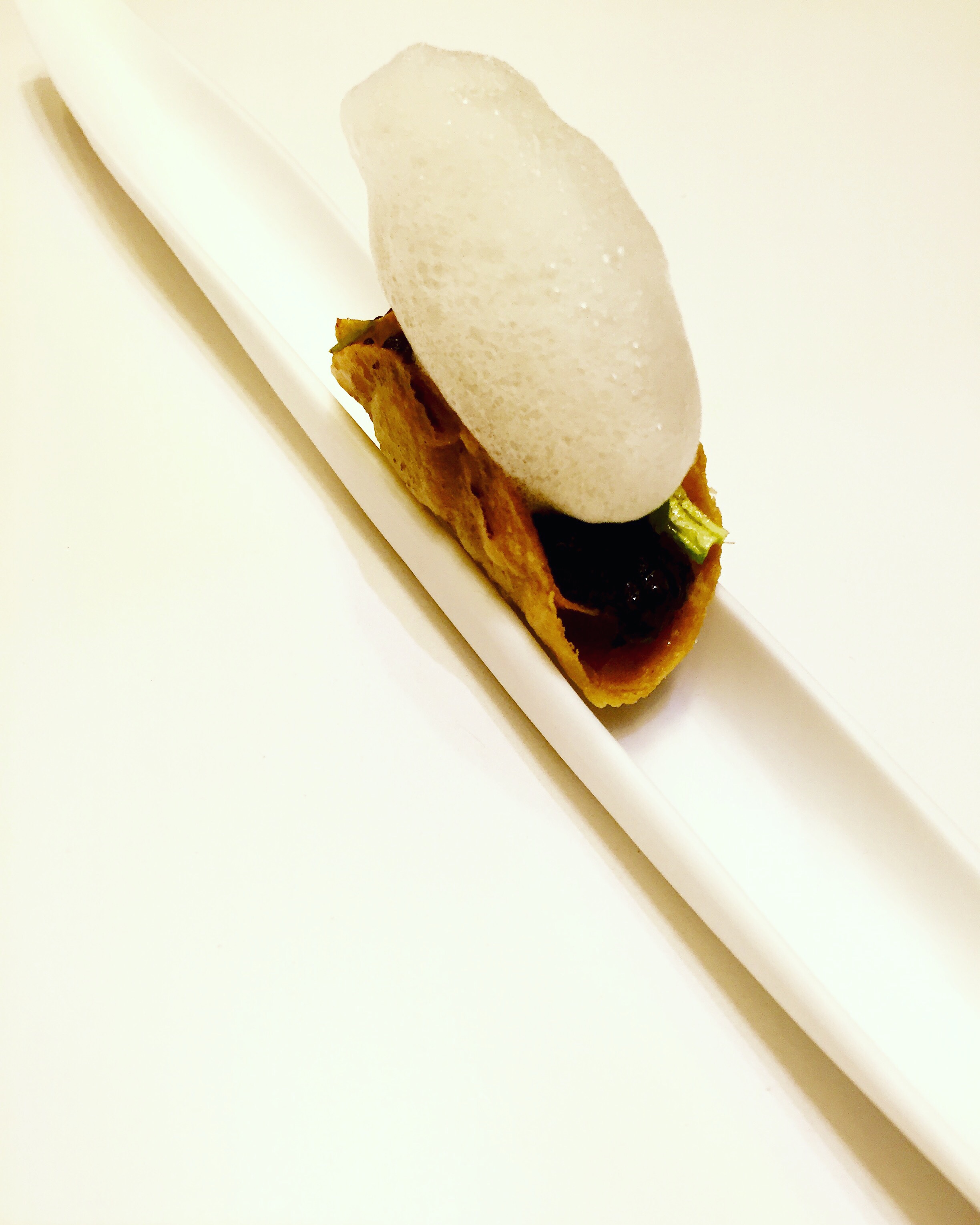 El Taco de huitlacoche con flor de calabaza y palo cortado apuesta por lo más mexicano que no sé si es el hongo del maíz, la deliciosa flor de calabaza o el propio taco, aquí crujiente, como las tostadas o las flautas mexicanas. El aire de palo cortado es tan etéreo como perfecto. No se necesita ni beber porque la bebida ya está en el plato. Y en forma de exquisitez gaseosa.