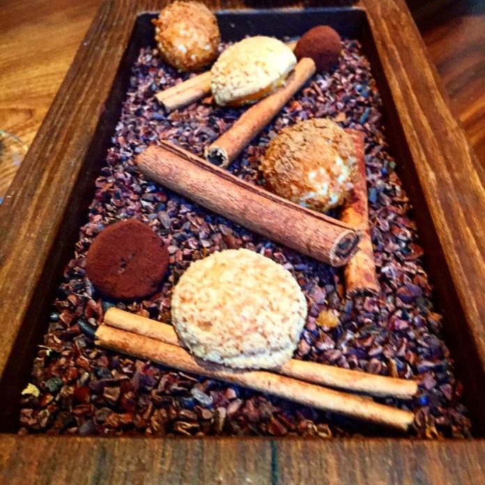 El love spice chocolate es especial para chocolateros aunque desigual en sus resultados. Perfecto el cremoso a las cuatro especias, seco e intenso el bizcocho y sofisticado visualmente -aunque para mí prescindible- un chicharrón algo grasiento a pesar del frescor del granizado de cacao que lo recubre.