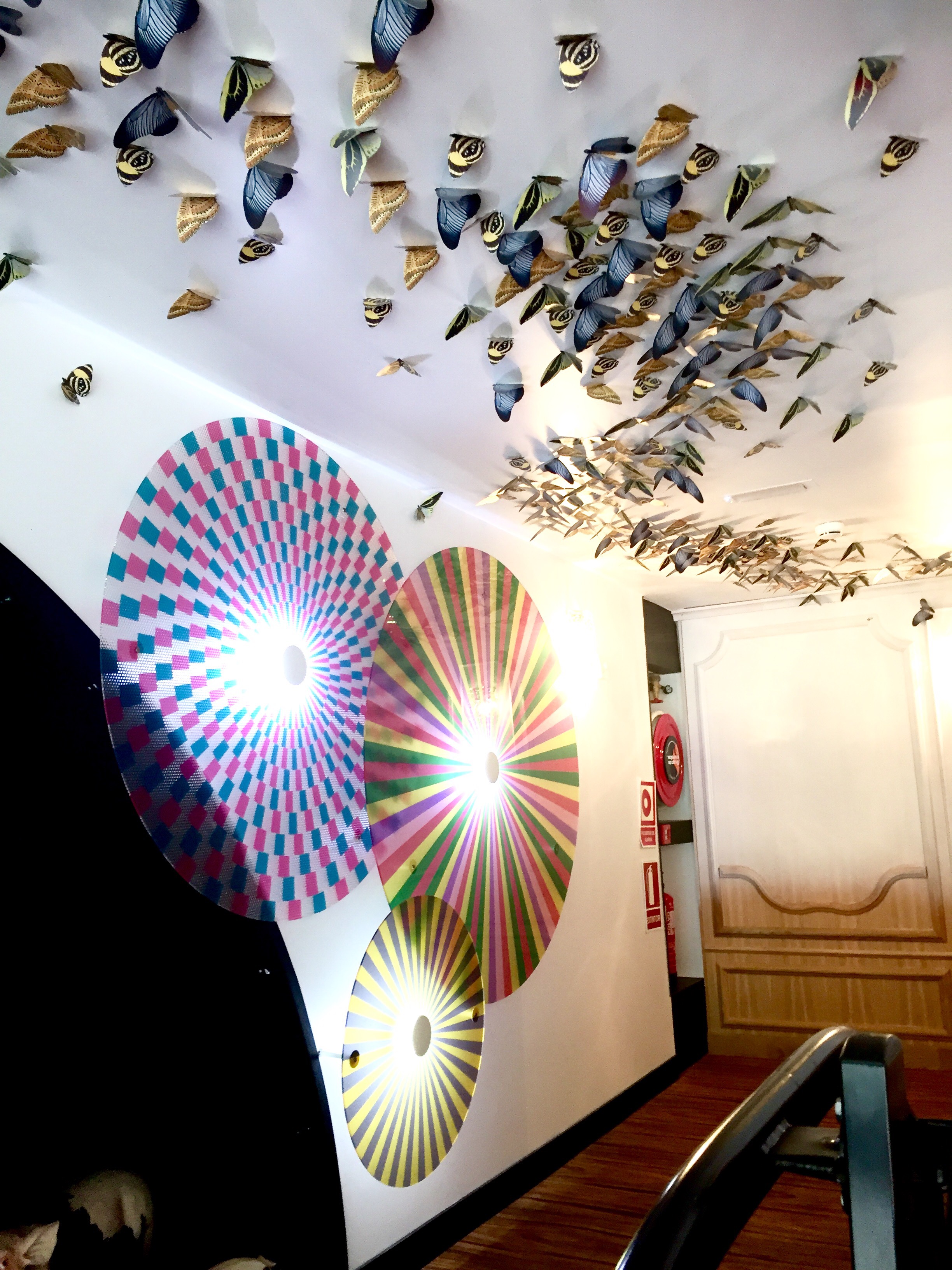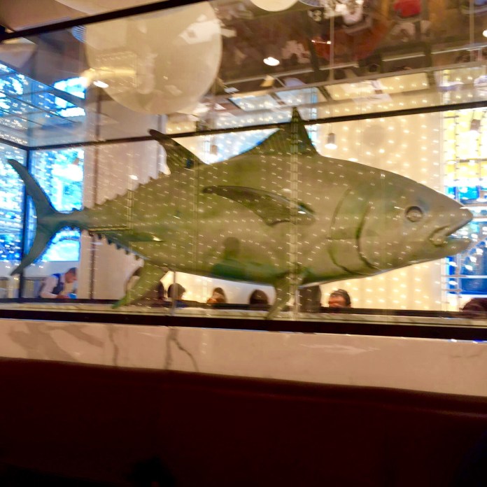 Valga esto para saber que estamos ante lugares donde no se practica la gran cocina ni se pretende, porque lo que se quiere es atraer al gran público. Es la eterna dicotomía entre prestigio y fama. El gran autor de best sellers busca el respeto de los académicos y el autor minoritario el aplauso del público porque muy pocos son los Lope de Vega, Chaplin o Verdi. Dani García, para esta segunda marca, ya probada en Marbella, ha encargado un suntuoso local a un decorador tan ubicuo, Lázaro Rosa Violán, que pronto habrá que poner en placas y anuncios «este local no ha sido decorado por LRV». Afortunadamente no se parece a muchos otros de los suyos y el espacio es de gran espectacularidad: chorros de luz, paredes cubiertas por miles de bombillitas que recuerdan portadas de feria, un globo aerostático sobre el bar y un enorme pez de cerámica encerrado en una urna de cristal, que si estuviera disecado y costara cien millones podría ser de Damien Hirst