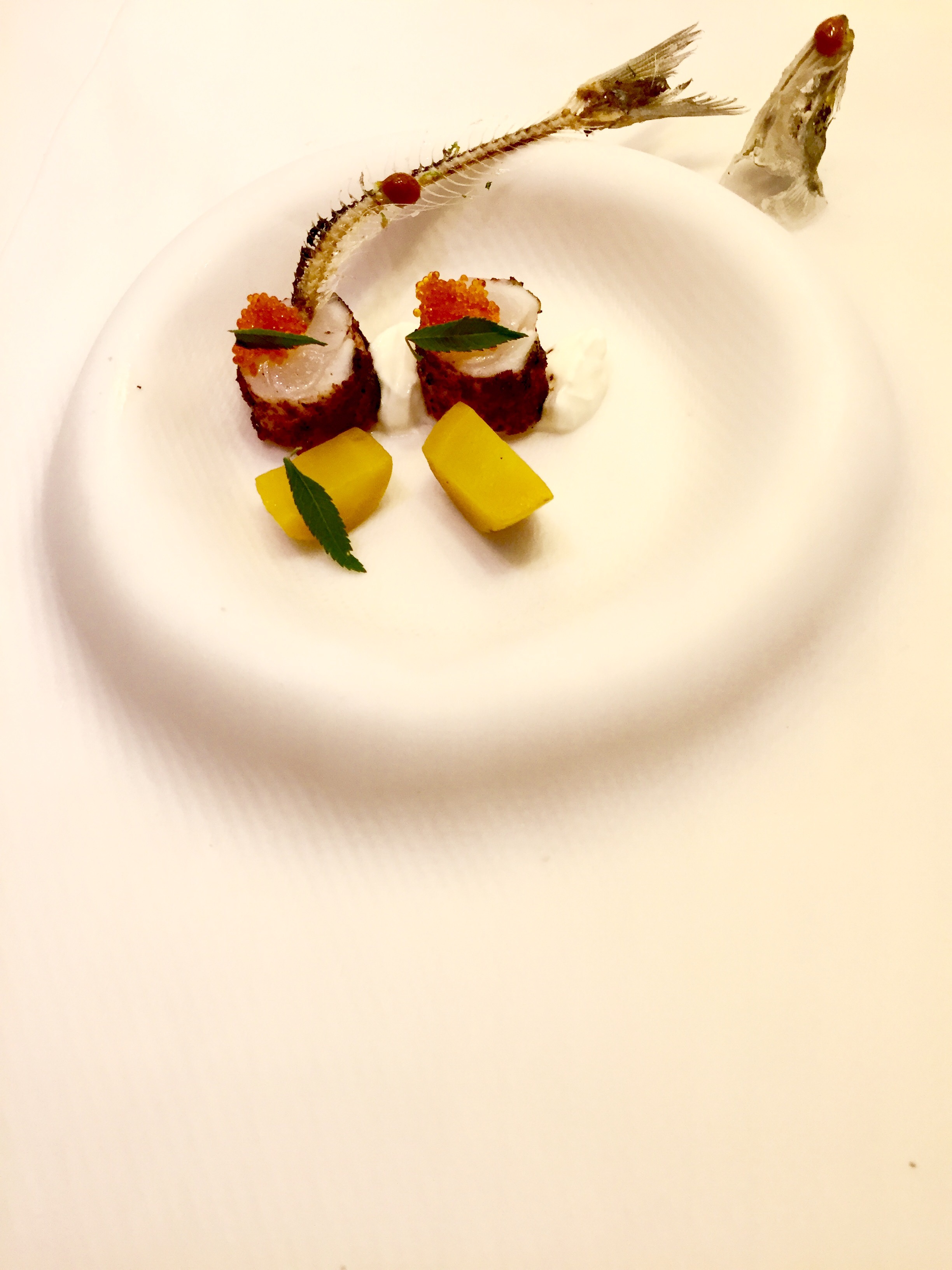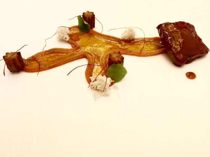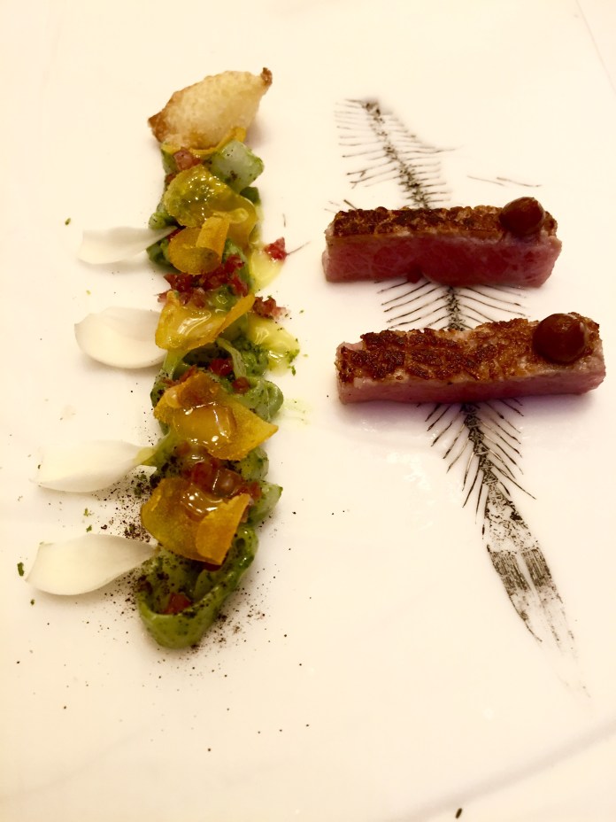-Pato pekinés XO: oreja de cochinillo crujiente con hoisin casera de moras, cremoso de pepino-lima y caviar de “Esturión Asetra” es todo eso y aunque parezca sacrílego mezclar tan buen caviar con oreja de cerdo, lo cierto es que no lo es porque el resultado es muñozianamente excitante. Un bocado maravilloso que también contiene unos deliciosos blinis que completan la cosa llevándonos a Rusia