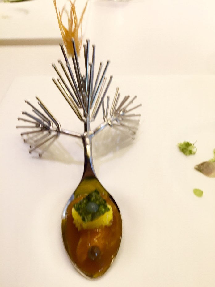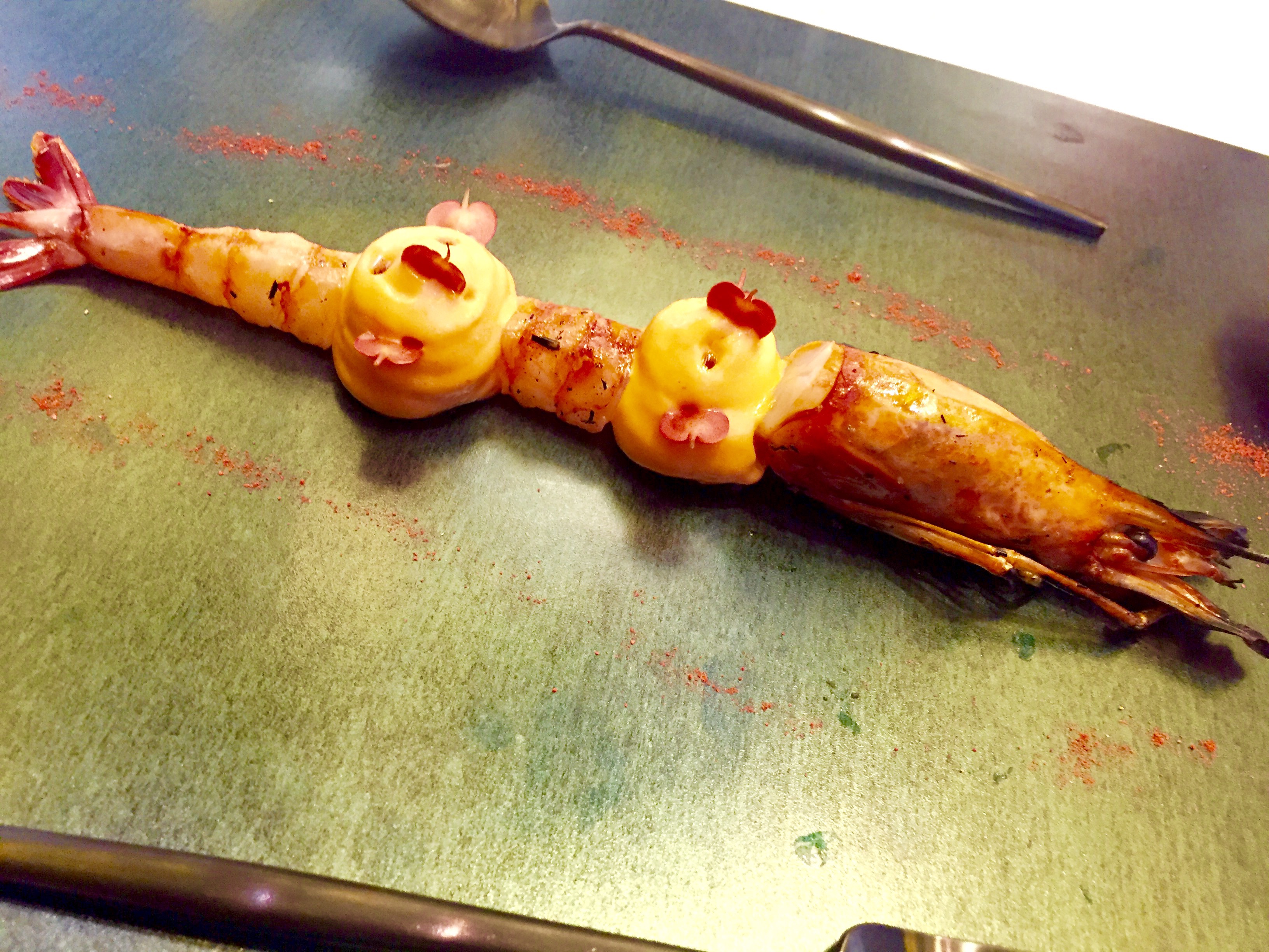 Lienzo 2. “Deja Vú” del mejor Viridiana… Gazpacho agripicante de fresitas silvestres y chile ahumado chipotle. Gamba roja a la “Robata japo», vainilla y croqueta líquida!!! Menos mal que esta mezcla no me entusiasmó. La gamba era excelente en su punto y sabor y el agridulcipicante (que todo eso era) también, pero no ambas cosas juntas. Menos mal, porque mi mente necesitaba un descanso, aunque fuera tan corto, porque la croqueta liquida también deja sin aliento con su exterior perfectamente rígido, su interior líquido y un sabor rotundo y fuerte que crea adicción.