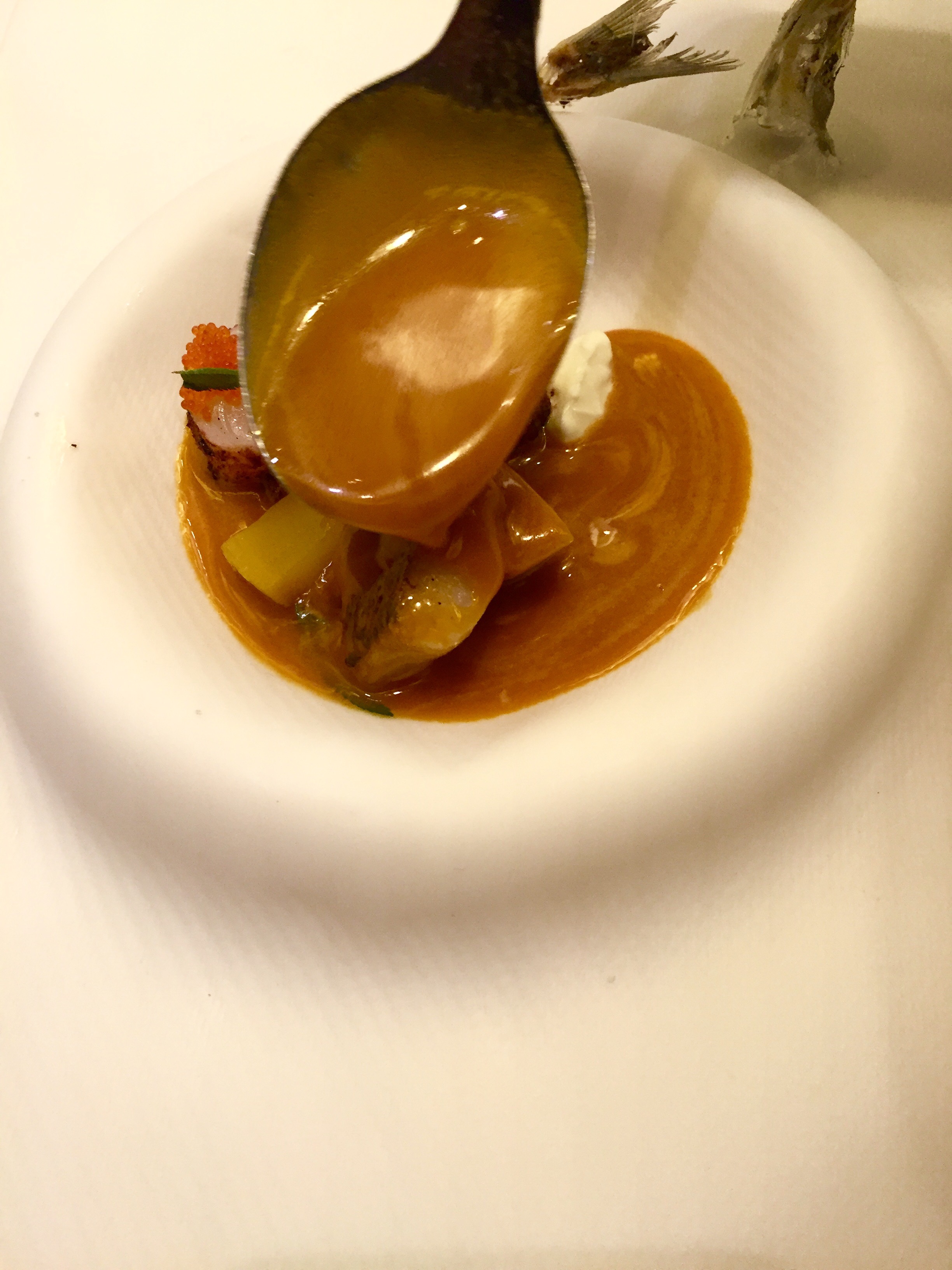 Lienzo 4. Bullabesa gaditana de pescados de roca, naranja agria y cigala tandoori… Olluco y huacatay!!                 1. Cabeza de cigala en ensalada agripicante, papaya e hibiscus. Por si alguien no se había percatado hasta ahora estamos en el mundo de la erudición gastronómica. Este hombre parece conocer todas las cocinas y casi todos los ingredientes y solo él puede mezclar bullabesa con caldillo de perro y los lomos de cigala con esas otras cosas que nunca había comido o no recordaba, yo que me creo tan viajado y… comido… Hablo del olluco y el huacatay, no de la papaya ni del hibisco, quede claro. Esas están en la deliciosa cabeza de la cigala que, con tal preparación, se aprovecha y disfruta como nunca.