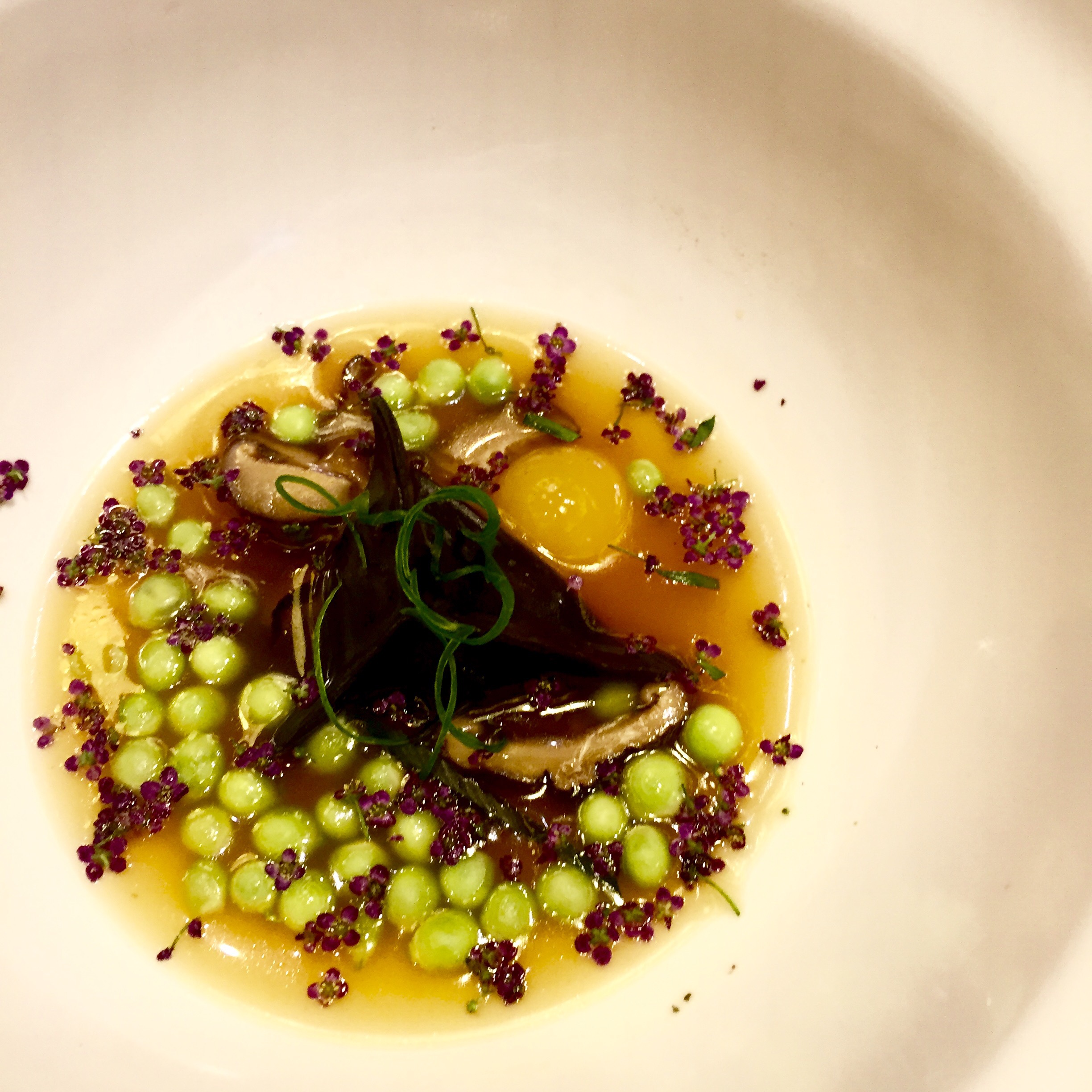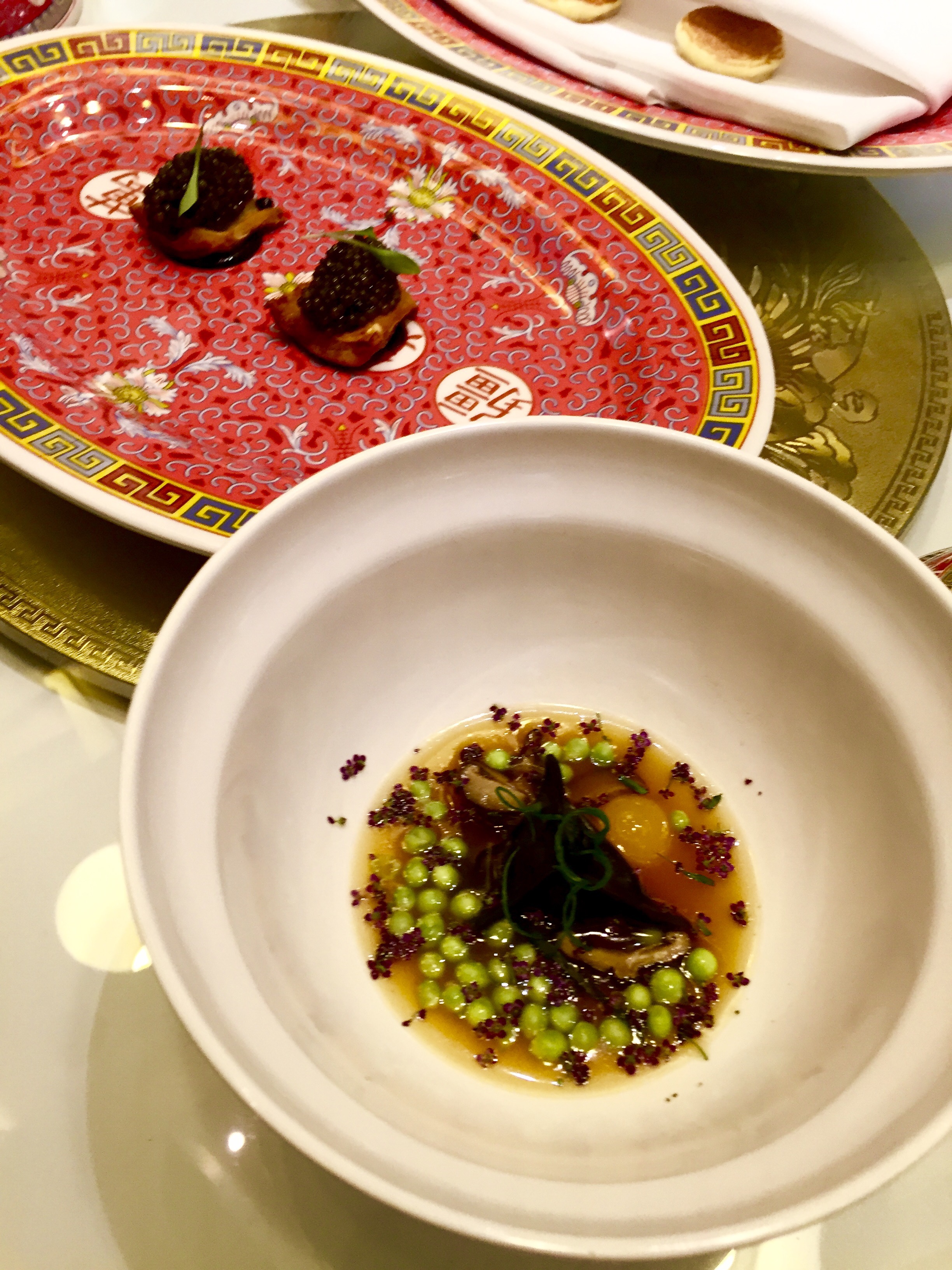 -Sopa wonton XO : dumpling de gallina de Guinea, estofada con shitakes, sopa de huesos asados al gingseng y guisantes no sólo tiene el sabor potente y maravilloso de un caldo perfecto y muy transparente, sino que los diminutos guisantes son como pequeñas perlas verdes.