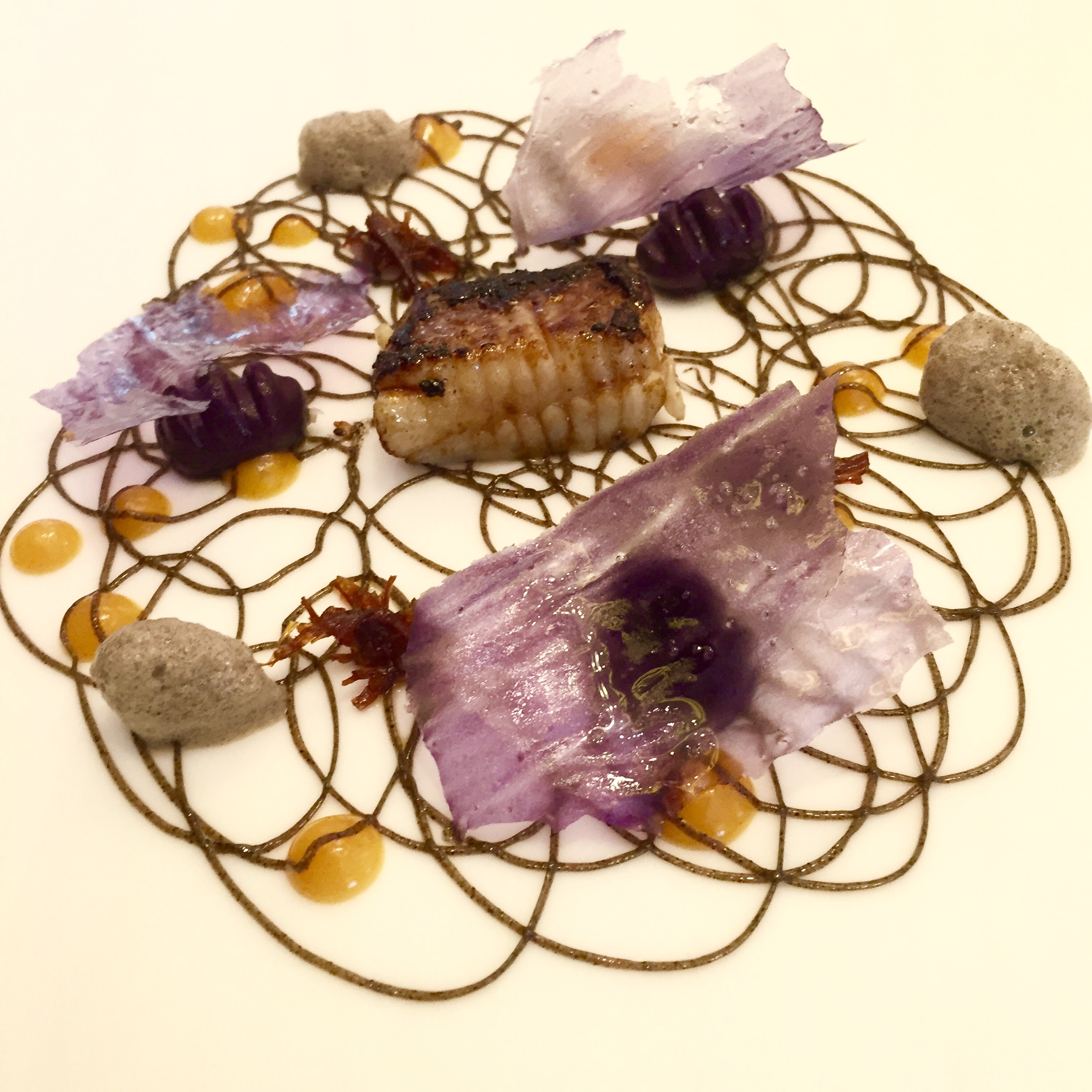 La llegada del Lienzo 5 es toda una sorpresa porque quizá es el plato más bello de la refección. Chuletón de raya asado con pimientas del mundo… a la mantequilla de ajos negros, kimchi casero, salsa XO y gnochis de patata violeta es un cuadro colorista con abundancia de negros y morados en el que destacan los sabores del ajo negro, de las pimientas y de los cristales de violeta. Todo son contrastes sutiles y abundantes texturas.