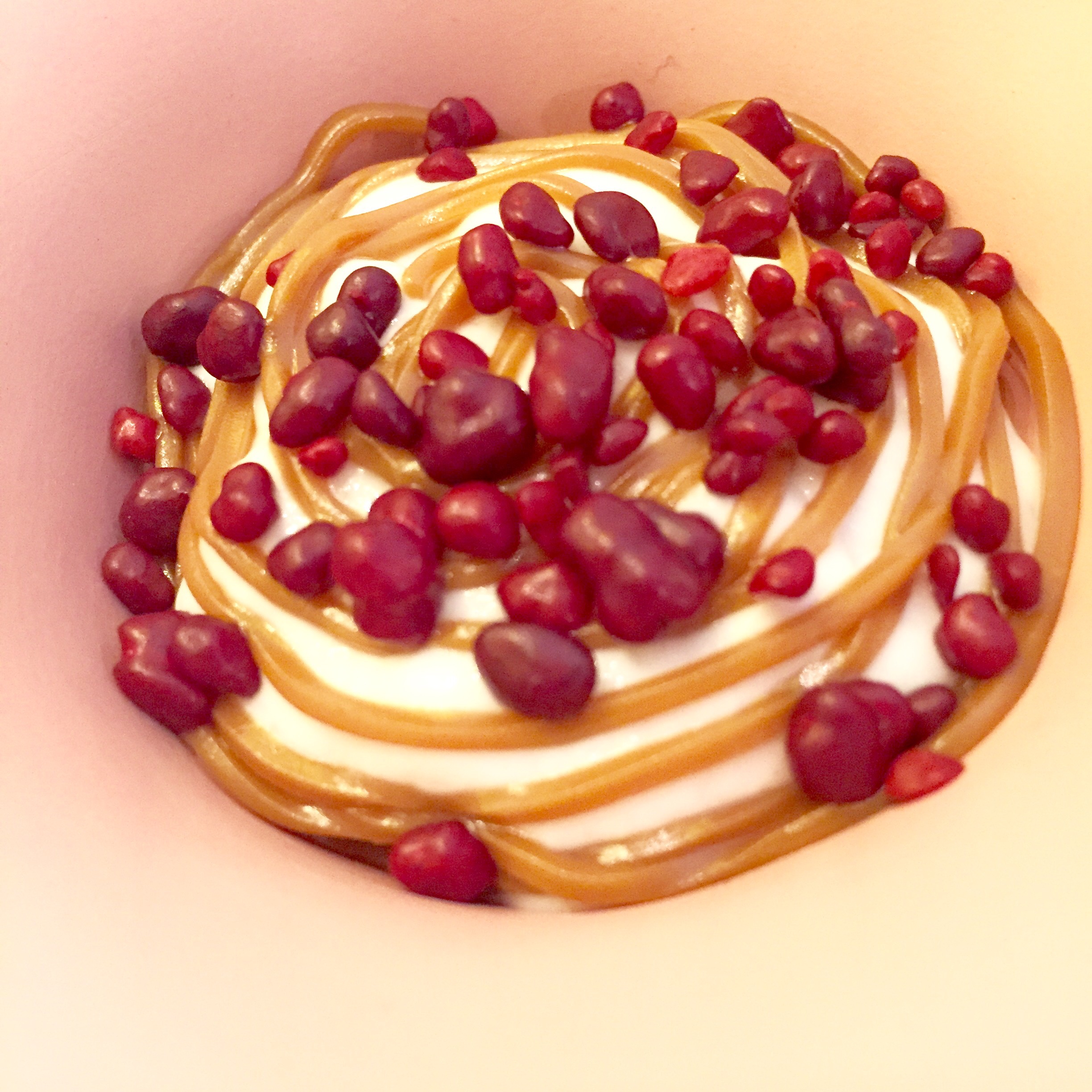Tras tanto frescor y suavidad -más que algodón parece una nube helada- nos asalta (no hay que perderse la parte de abajo de la fotografía) una boca sin dueño y sobre todo, sin cabeza que la albergue, una inquietante oquedad que parece inspirada en El Bosco o en Delvaux y está también realizada por el ya mencionado Piñero. Nos ofrece sobre su rojo brillante un mochi de «galleta con leche» realizado con esa masa de arroz típica del mochi, que aquí dominan y rellenan con tan untuosa e infantil mezcla.
