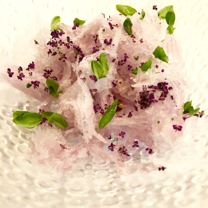 Lienzo 14. Existe el algodón helado???Moras, violetas, albahaca… Y algodón helado!! Pues claro que existe y es gracias a ellos, que elaboran unas láminas de hielo con algo llamado kakigori y que es una máquina de helado japonesa. Sobre él vierten una esencia de moras y violetas llena de color que contrasta muy bien con el herbáceo sabor de la albahaca, ingrediente poco frecuente en un postre.